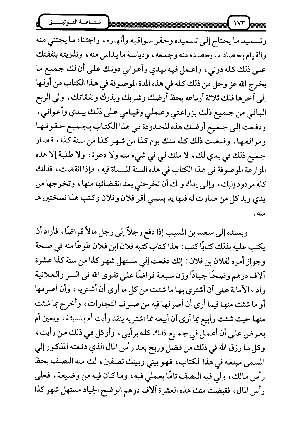 وبسنده إلى سعيد بن المسيب إذا دفع رجلا إلى رجل مالا قراضا، فأراد أن يكتب عليه بذلك كتابا كتب: هذا كتاب كتبه فلان بن فلان طوعا منه في صحة وجواز أمره لفلان بن فلان: إنك دفعت إلي مستهل شهر كذا من سنة كذا عشرة آلاف درهم وضحا جيادا وزن سبعة قراضا على تقوى الله في السر والعلانية وأداء الأمانة على أن أشتري بها ما شئت من كل ما أرى أن أشتريه، وأن أصرفها أو ما شئت منها فيما أرى أن أصرفها فيه من صنوف التجارات، وأخرج بما شئت منها حيث شئت وأبيع بما أرى أن أبيعه مما اشتريه بنقد رأيت أم بنسيئة، وبعين أم بعض على أن أعمل في جميع ذلك كله برأيي، وأوكل في ذلك من رأيت، وكل ما رزق الله في ذلك من فضل وربح بعد رأس المال الذي دفعته المذكور إلي المسمى مبلغه في هذا الكتاب، فهو بيني وبينك نصفين، لك منه النصف بحظ رأس مالك، ولي فيه النصف تاما بعملي فيه، وما كان فيه من وضيعة، فعلى رأس المال، فقبضت منك هذه العشرة آلاف درهم الوضح الجياد مستهل شهر كذا