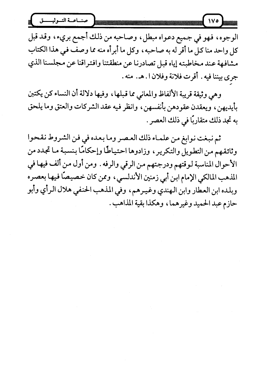 ثم نبغت نوابع من علماء ذلك العصر وما بعده في فن الشروط نقحوا وثائقهم من التطويل والتكرير، وزادوها احتياطا وإحكاما بنسبة ما تجدد من الأحوال المناسبة لوقتهم ودرجتهم من الرقي والرفه. ومن أول من ألف فيها في المذهب المالكي الإمام ابن أبي زمنين الأندلسي، وممن كان خصيصا فيها بعصره وبلده ابن العطار وابن الهندي وغيرهم، وفي المذهب الحنفي هلال الرأي وأبو حازم عبد الحميد وغيرهما، وهكذا بقية المذاهب.