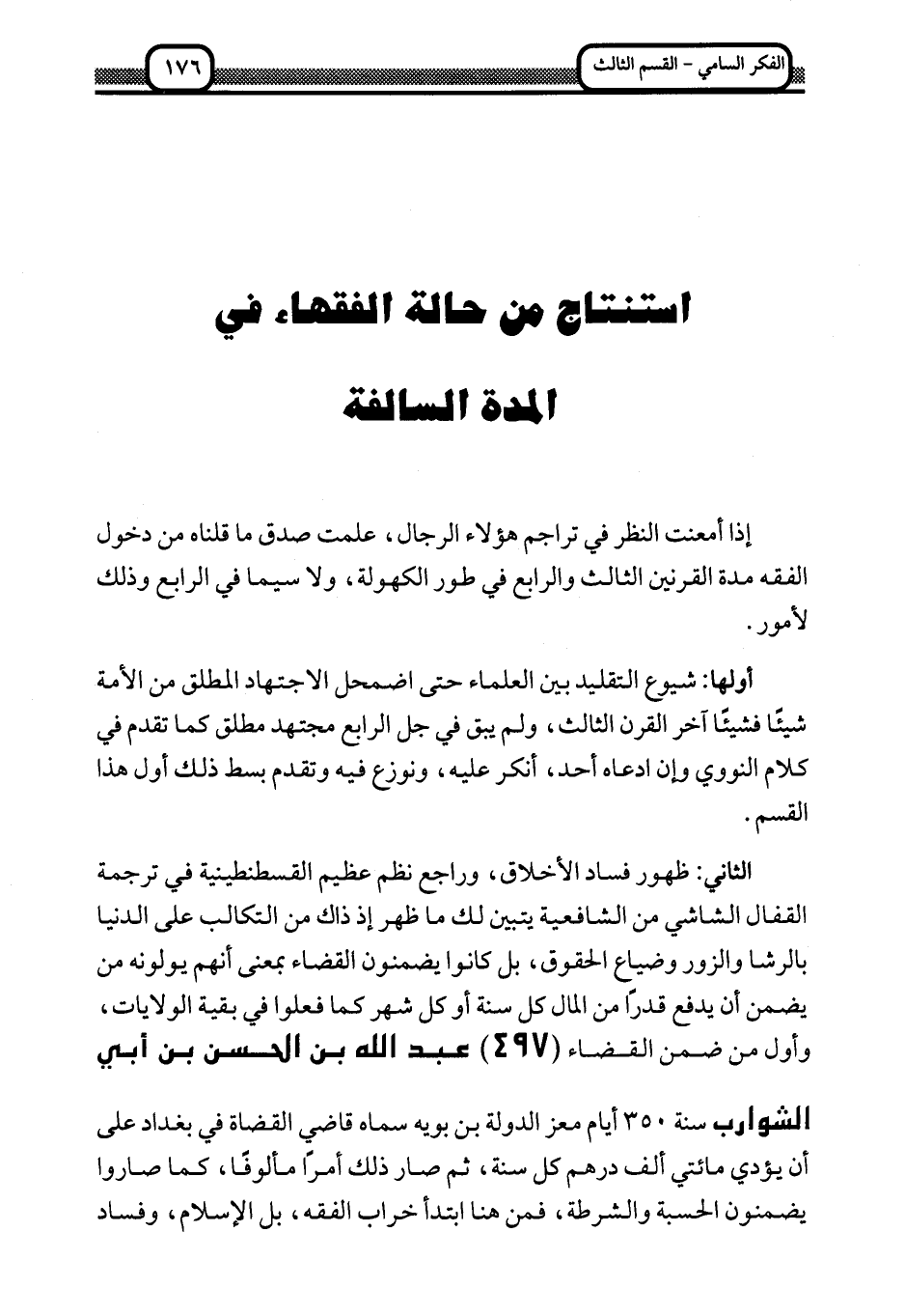 الثاني: ظهور فساد الأخلاق، وراجع نظم عظيم القسطنطينية في ترجمة الققال الشاشي من الشافعية يتبين لك ما ظهر إذ ذاك من التكالب على الدنيا بالرشا والزور وضياع الحقوق، بل كانوا يضمنون القضاء بمعنى أنهم يولونه من يضمن أن يدفع قدرا من المال كل سنة أو كل شهر كما فعلوا في بقية الولايات، وأول من ضمن القضاء 497- عبد الله بن الحسن بن أبي الشوارب: سنة 350 أيام معز الدولة بن بويه سماه قاضي القضاة في بغداد على أن يؤدي مائتي ألف درهم كل سنة، ثم صار ذلك أمرا مألوفا، كما صاروا يضمنون الحسبة والشرطة، فمن هناك ابتدأ خراب الفقه، بل الإسلام، وفساد
