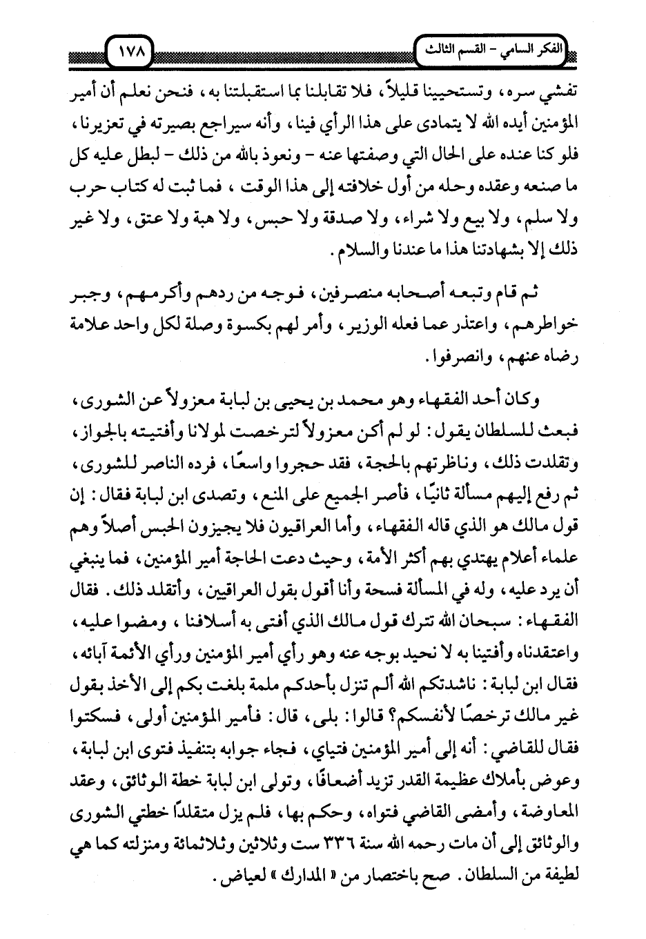 وكان أحد الفقهاء وهو محمد بن يحيى بن لبابة معزولا عن الشورى، فبعث للسلطان يقول: لو لم أكن معزولا لترخصت لمولانا وأفتيته بالجواز، وتقلدت ذلك، وناظرتهم بالحجة، فقد حجروا واسعا، فرده الناصر للشورى، ثم رفع إليهم مسألة ثانيا، فأصر الجميع على المنع، وتصدى ابن لبابة فقال: إن قول مالك هو الذي قاله الفقهاء، وأما العراقيون فلا يجيزون الحبس أصلا وهم علماء أعلام يهتدي بهم أكثر الأمة، وحيث دعت الحاجة أمير المؤمنين، فما ينبغي أن يرد عليه، وله في المسألة فسحة وأنا أقول بقول العراقيين، وأتقلد ذلك. فقال الفقهاء: سبحان الله تترك قول مالك الذي أفتى به أسلافنا، ومضوا عليه، واعتقدناه وأفتينا به لا نحيد بوجه عنه وهو رأي أمير المؤمنين ورأي الأئمة آبائه، فقال ابن لبابة: ناشدتكم الله ألم تنزل بأحدكم ملمة بلغت بكم إلى الأخذ بقول غير مالك ترخصا لأنفسكم؟ قالوا: بلى، قال: فأمير المؤمنين أولى، فسكتوا فقال للقاضي: أنه إلى أمير المؤمنين فتياي، فجاء جوابه بتنفيذ فتوى ابن لبابة، وعوض بأملاك عظيمة القدر تزيد أضعافا، وتولى ابن لبابة خطة الوثائق، وعقد المعاوضة، وأمضى القاضي فتواه، وحكم بها، فلم يزل متقلدا خطتي الشورى والوثائق إلى أن مات رحمه الله سنة 336 ست وثلاثين وثلاثمائة ومنزلته كما هي لطيفة من السلطان. صح باختصار من "المدارك" لعياض.