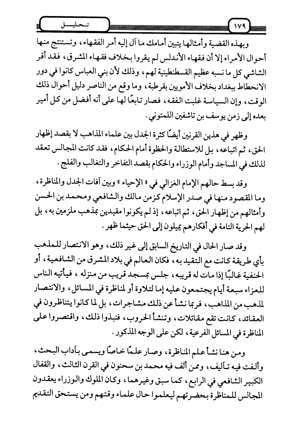 وقد بسط حالهم الإمام الغزالي في "الإحياء" وبين آفات الجدل والمناظرة، وما المقصود منها في صدر الإسلام كزمن مالك والشافعي ومحمد بن الحسن وأمثالهم من إظهار الحق، ثم اتباعه؛ إذ لم يكونوا مقيدين بمذهب ملزمين به، بل لهم الحرية التامة في أفكارهم يميلون إلى الحق حيثما ظهر.