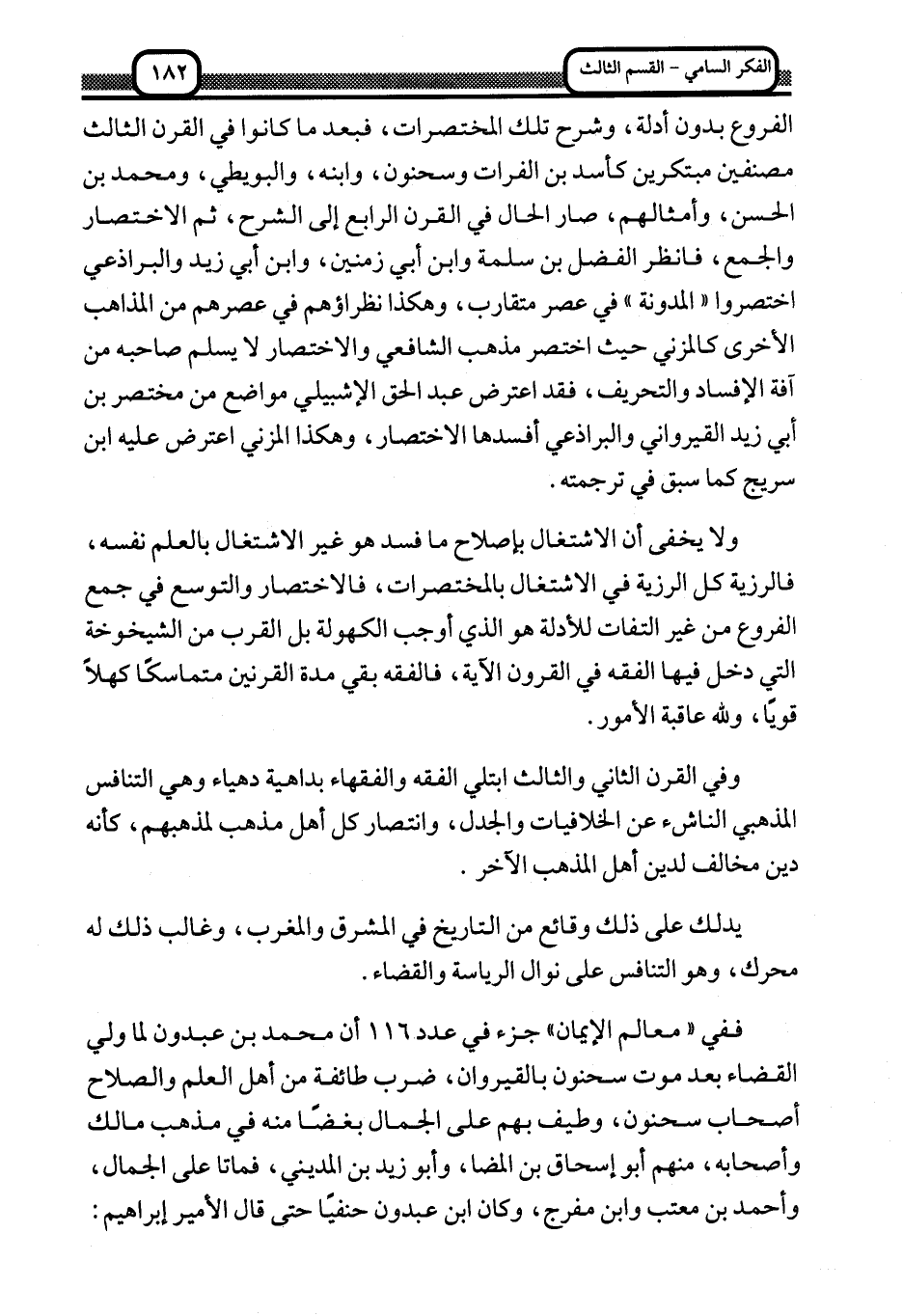 الفروع بدون أدلة، وشرح تلك المختصرات، فبعد ما كانوا في القرن الثالث مصنفين مبتكرين كأسد بن الفرات وسحنون، وابنه، والبويطي، ومحمد بن الحسن، وأمثالهم، صار الحال في القرن الرابع إلى الشرح، ثم الاختصار والجمع، فانظر الفضل بن سلمة وابن أبي زمنين، وابن أبي زيد والبراذعي اختصروا "المدونة" في عصر متقارب، وهكذا نظراؤهم في عصرهم من المذاهب الأخرى كالمزني حيث اختصر مذهب الشافعي والاختصار لا يسلم صاحبه من آفة الإفساد والتحريف، فقد اعترض عبد الحق الإشبيلي مواضع من مختصر ابن أبي زيد القيرواني والبراذعي أفسدها الاختصار، وهكذا المزني اعترض عليه ابن سريج كما سبق في ترجمته.