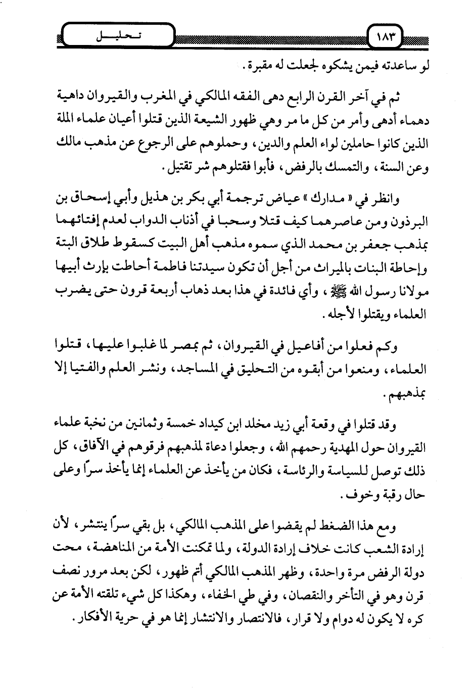 ثم في آخر القرن الرابع دهى الفقه المالكي في المغرب والقيروان داهية دهماء أدهى وأمر من كل ما مر وهي ظهور الشيعة الذين قتلوا أعيان علماء الملة الذين كانوا حاملين لواء العلم والدين، وحملوهم على الرجوع عن مذهب مالك وعن السنة، والتمسك بالرفض، فأبوا فقتلوهم شر تقتيل.