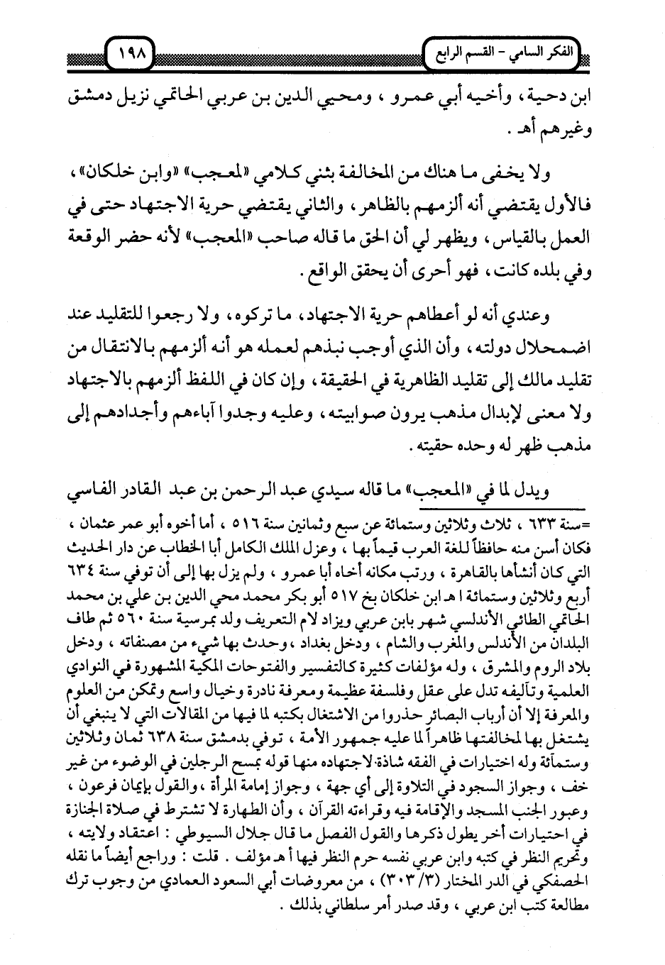 = سنة 633، ثلاث وثلاثين وستمائة عن سبع وثمانين سنة 516، أما أخوه أبو عمر عثمان، فكان أسن منه حافظا للغة العرب قيما بها، وعزل الملك الكامل أبا الخطاب عن دار الحديث التي كان أنشأها بالقاهرة، ورتب مكانه أخاه أبا عمر، ولم يزل بها إلى أن توفي سنة 634 أربع وثلاثين وستمائة. ا. هـ. ابن خلكان بخ 517 أبو بكر محمد محيي الدين بن علي بن محمد الحاتمي الطائي الأندلسي شهر بابن عربي ويزاد لام التعريف ولد بمرسية سنة 560 ثم طاف البلدان من الأندلس والمغرب والشام، ودخل بغداد، وحدث بها شيء من مصنفاته، ودخل بلاد الروم والمشرق، وله مؤلفات كثيرة كالتفسير والفتوحات المكية المشهورة في النوادي العلمية وتآليفه تدل على عقل وفلسفة عظيمة ومعرفة نادرة وخيال واسع وتمكن من العلوم والمعرفة إلا أن أرباب البصائر حذروا من الاشتغال بكتبه لما فيها من المقالات التي لا ينبغي أن يشتغل بها لمخالفتها ظاهرا لما عليه جمهور الأمة، توفي بدمشق سنة 638 ثمان وثلاثين وستمائة وله اختيارات في الفقفه شاذة لاجتهاده منها قوله بمسح الرجلين في الوضوء من غير خف، وجواز السجود في التلاوة إلى أي جهة، وجواز إمامة المرأة، والقول بإيمان فرعون، وعبور الجنب المسجد والإقامة فيه وقراءته القرآن، وأن الطهارة لا تشترط في صلاة الجنازة في احتيارات أخر يطول ذكرها والقول الفصل ما قال جلال السيوطي: اعتقاد ولايته، وتحريم النظر في كتبه وابن عربي نفسه حرم النظر فيها. ا. هـ. مؤلف. قلت: وراجع أيضا ما نقله الحصفكي في الدر المختار "3/ 303"، من معروضات أبي السعود العمادي من وجوب ترك مطالعة كتب ابن عربي، وقد صدر أمر سلطاني بذلك.