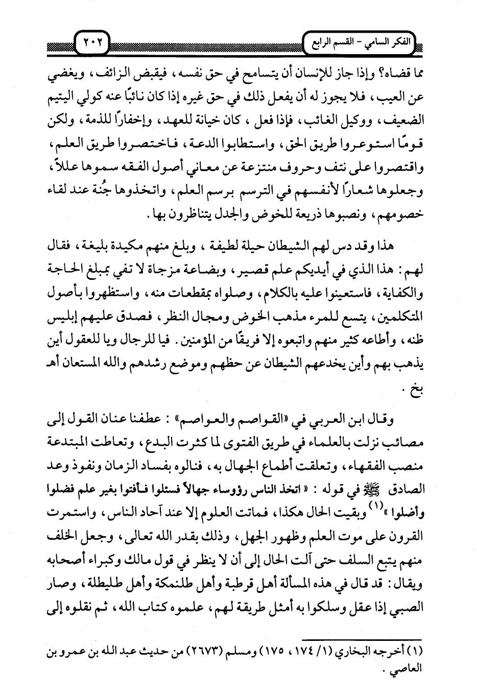 وقال ابن العربي في "القواصم والعواصم": عطفنا عنان القول إلى مصائب نزلت بالعلماء في طريق الفتوى لما كثرت البدع، وتعاطت المبتدعة منصب الفقهاء، وتعلقت أطماع الجهال به، فنالوه بفساد الزمان ونفوذ وعد الصادق -صلى الله عليه وسلم- في قوله: "اتخذ الناس رءوسا جهالا فسئلوا فأفتوا بغير علم فضلوا وأضلوا" 1 وبقيت الحال هكذا، فماتت العلوم إلا عند آحاد الناس، واستمرت القرون على موت العلم وظهور الجهل، وذلك بقدر الله تعالى، وجعل الخلف منهم يتبع السلف حتى آلت الحال إلى أن لا ينظر في قول مالك وكبراء أصحابه ويقال: قد قال في هذه المسألة أهل قرطبة وأهل طلنمكة وأهل طليطلة، وصار الصبي إذا عقل وسلكوا به أمثل طريقة لهم، علموه كتاب الله، ثم نقلوه إلى