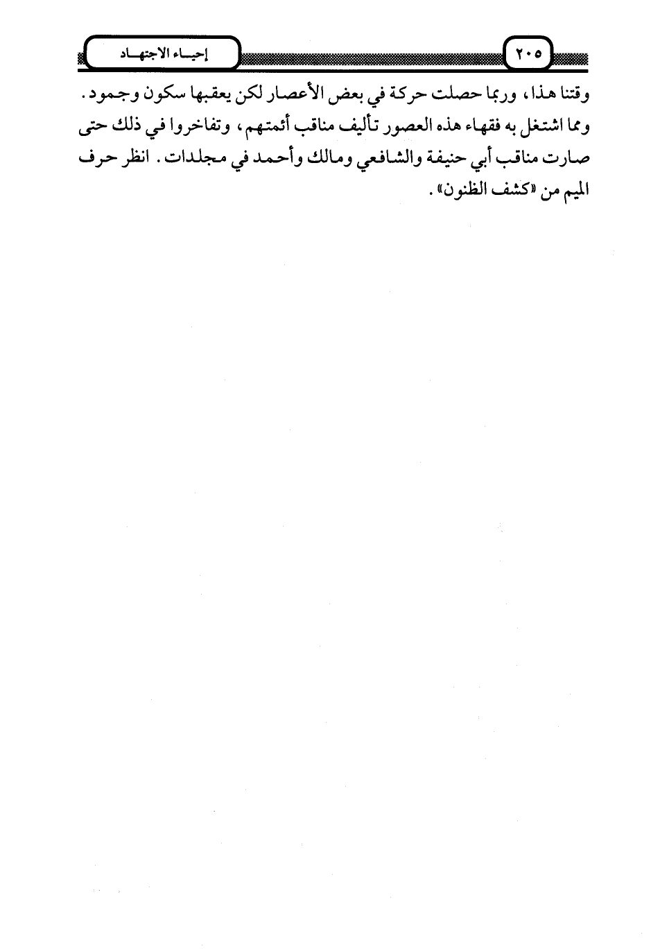 وقتنا هذا، وربما حصلت حركة في بعض الأعصار لكن يعقبها سكون وجمود. ومما اشتغل به فقهاء هذه العصور تأليف مناقب أئمتهم، وتفاخروا في ذلك حتى صارت مناقب أبي حنيفة والشافعي ومالك وأحمد في مجلدات. انظر حرف الميم من "كشف الظنون".