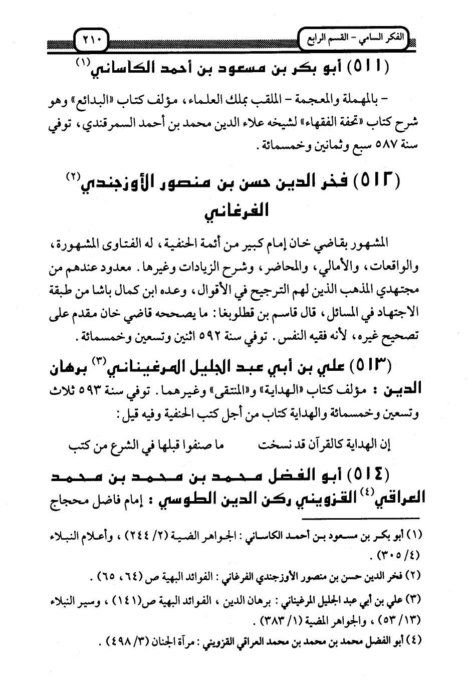 513- علي بن أبي عبد الجليل المرغيناني 3 برهان الدين: مؤلف كتاب "الهداية" و"المنتقى" وغيرهما. توفي سنة 593 ثلاث وتسعين وخمسمائة والهداية كتاب من أجل كتب الحنفية وفيه قيل: