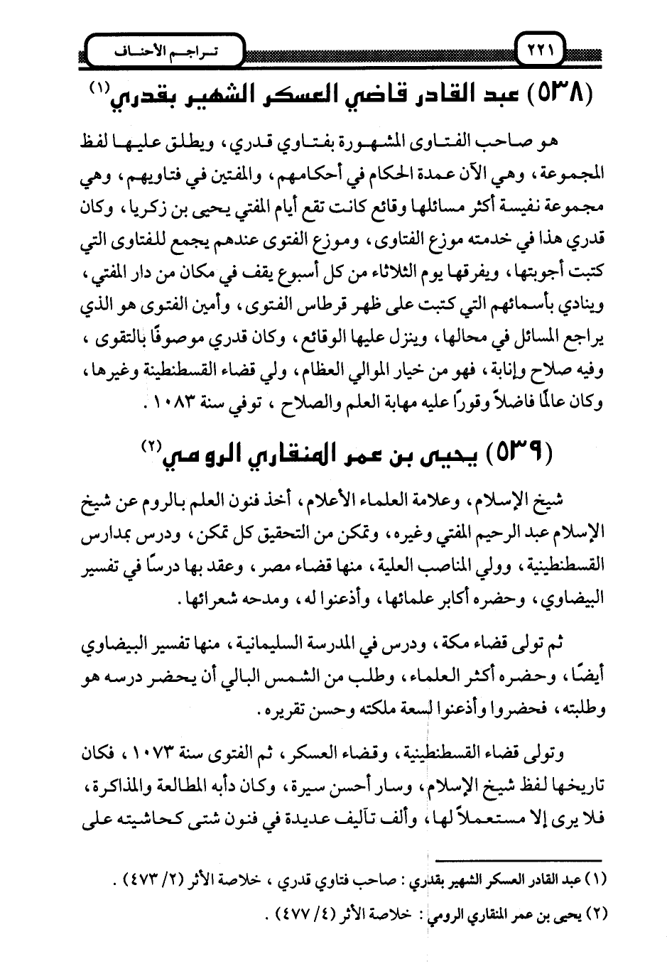 1 عبد القادر العسكر الشهير بقدري: صاحب فتاوى قدري، خلاصة الأثر "2/ 473".