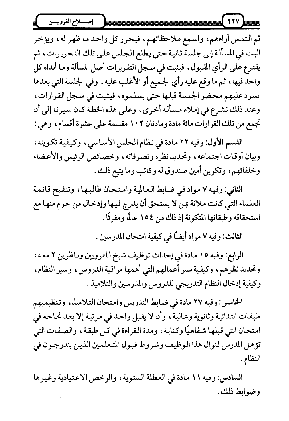 الرابع: وفيه 15 مادة في إحداث توظيف شيخ للقرويين وناظرين 2 معه، وتحديد نظرهم، وكيفية سير أعمالهم التي أهمها مراقبة الدروس، وسير النظام، وكيفية إدخال النظام التدريجي للدروس والمدرسين والتلاميذ.