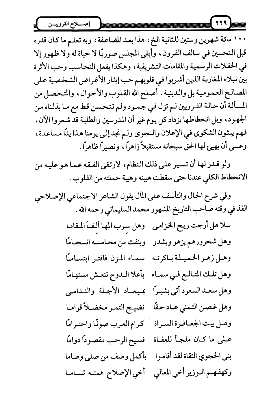 وفي شرح الحال والتأسف على المآل يقول الشاعر الاجتماعي الإصلاحي الفذ في وقته صاحب التاريخ المشهور محمد السليماني رحمه الله:
