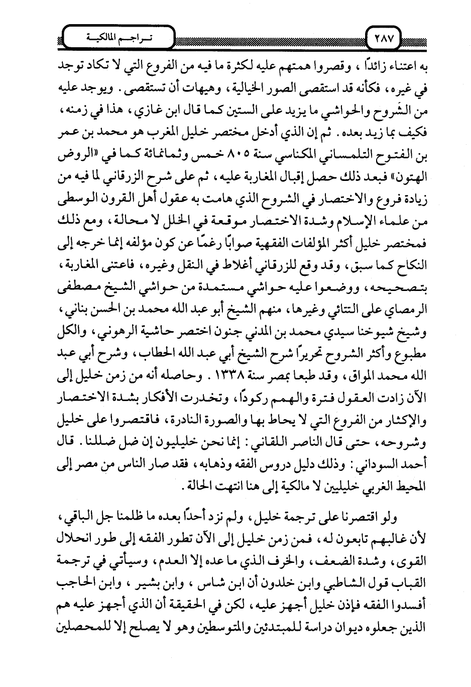 به اعتناء زائدا، وقصروا همتهم عليه لكثرة ما فيه من الفروع التي لا تكاد توجد في غيره، فكأنه قد استقصى الصور الخيالية، وهيهات أن تستقصى. ويوجد عليه من الشروح والحواشي ما يزيد على الستين كما قال ابن غازي، هذا في زمنه، فكيف بما زيد بعده. ثم إن الذي أدخل مختصر خليل المغرب هو محمد بن عمر بن الفتوح التلمساني المكناسي سنة 805 خمس وثمانمائة كما في "الروض الهتون" فبعد ذلك حصل إقبال المغاربة عليه، ثم على شرح الزرقاني لما فيه من زيادة فروع والاختصار في الشروح الذي هامت به عقول أهل القرون الوسطى من علماء الإسلام وشدة الاختصار موقعة في الخلل لا محالة، ومع ذلك فمختصر خليل أكثر المؤلفات الفقيهة صوابا رغما عن كون مؤلفه إنما خرجه إلى النكاح كما سبق، وقد وقع للزرقاني أغلاط في النقل وغيره، فاعتنى المغاربة، بتصحيحه، ووضعوا عليه حواشي مستمدة من حواشي الشيخ مصطفى الرمصاي على التتائي وغيرها، منهم الشيخ أبو عبد الله محمد بن الحسن بناني، وشيخ شيوخنا سيدي محمد بن المدني جنون اختصر حاشية الرهوني، والكل مطبوع وأكثر الشروح تحريرا شرح الشيخ أبي عبد الله الحطاب، وشرح أبي عبد الله محمد المواق، وقد طبعا بمصر سنة 1338. وحاصله أنه من زمن خليل إلى الآن زادت العقول فترة والهمم ركودا، وتخدرت الأفكار بشدة الاختصار والإكثار من الفروع التي لا يحاط بها والصورة النادرة، فاقتصروا على خليل وشروحه، حتى قال الناصر اللقاني: إنما نحن خليليون إن ضل ضللنا. قال أحمد السوداني: وذلك دليل دروس الفقه وذهابه، فقد صار الناس من مصر إلى المحيط الغربي خليليين لا مالكية إلى هنا انتهت الحالة.