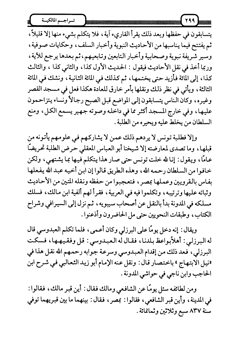 وإلا فطلبة تونس لا يردهم ذلك عمن لا يشاركهم في علومهم يأتونه من قبلها، وما تصدى لمعارضته إلا شيخنا أبو العباس المعقلي حرض الطلبة تحريضا عاما، ويقول: إنا لله خلت تونس حتى صار هذا يتكلم فيها بما يشتهي، ولكن خافوا من السلطان رحمه الله، وهذه الطريق قالوا إن ابن أخيه عبد الله يفعلها بفاس بالقرويين وعملها بمصر، فتعجبوا من حفظه ونقله المتين من الأحاديث وثباته عليها وترتيبه، وتكلموا فيه في العربية، فقرأ لهم ألفية ابن مالك، فسلك مسلكه في المدونة بدأ بالنقل عن أصحاب سيبويه، ثم نزل إلى السيرافي وشراح الكتاب، وطبقات النحويين حتى مل الحاضرون وأذعنوا.