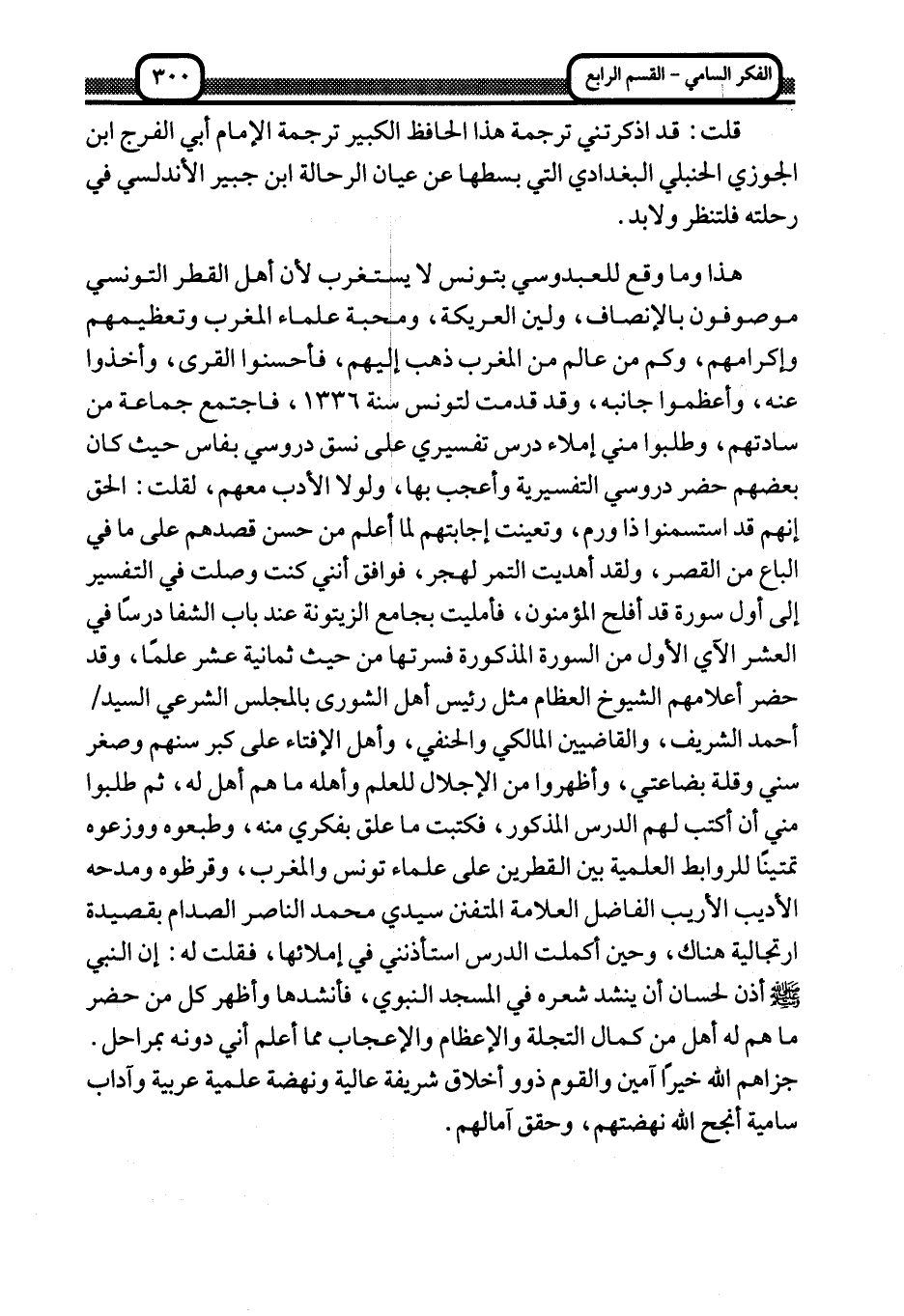 هذا وما وقع للعبدوسي بتونس لا يستغرب لأن أهل القطر التونسي موصوفون بالإنصاف، ولين العريكة، ومحبة علماء المغرب وتعظيمهم وإكرامهم، وكم من عالم من المغرب ذهب إليهم، فأحسنوا القرى، وأخذوا عنه، وأعظموا جانبه، وقد قدمت لتونس سنة 1336، فاجتمع جماعة من سادتهم، وطلبوا مني إملاء درس تفسيري على نسق دروسي بفاس حيث كان بعضهم حضر دروسي التفسيرية وأعجب بها، ولولا الأدب معهم، لقلت: الحق أنهم قد استسمنوا ذا ورم، وتعينت إجابتهم لما أعلم من حسن قصدهم على ما في الباع من القصر، ولقد أهديت التمر لهجر، فوافق أنني كنت وصلت في التفسير إلى أول سورة قد أفلح المؤمنون، فأمليت بجامع الزيتونة عند باب الشفا درسا في العشر الآي الأول من السورة المذكورة فسرتها من حيث ثمانية عشر علما، وقد حضر أعلامهم الشيوخ العظام مثل رئيس أهل الشورى بالمجلس الشرعي السيد/ أحمد الشريف، والقاضيين المالكي والحنفي، وأهل الإفتاء على كبر سنهم وصغر سني وقلة بضاعتي، وأظهروا من الإجلال للعلم وأهله ما هم أهل له، ثم طلبوا مني أن أكتب لهم الدرس المذكور، فكتبت ما علق بفكري منه، وطبعوه ووزعوه تمتينا للروابط العلمية بين القطرين على علماء تونس والمغرب، وقرظوه ومدحه الأديب الأريب الفاضل العلامة المتفنن سيدي محمد الناصر الصدام بقصيدة ارتجالية هناك، وحين أكملت الدرس استأذنني في إملائها، فقلت له: إن النبي -صلى الله عليه وسلم- أذن لحسان أن ينشد شعره في المسجد النبوي، فأنشدها وأظهر كل من حضر ما هم له أهل من كمال التجلة والإعظام والإعجاب مما أعلم أني دونه بمراحل. جزاهم الله خيرا آمين والقوم ذوو أخلاق شريفة عالية ونهضة علمية عربية وآداب سامية أنجح الله نهضتهم، وحقق آمالهم.