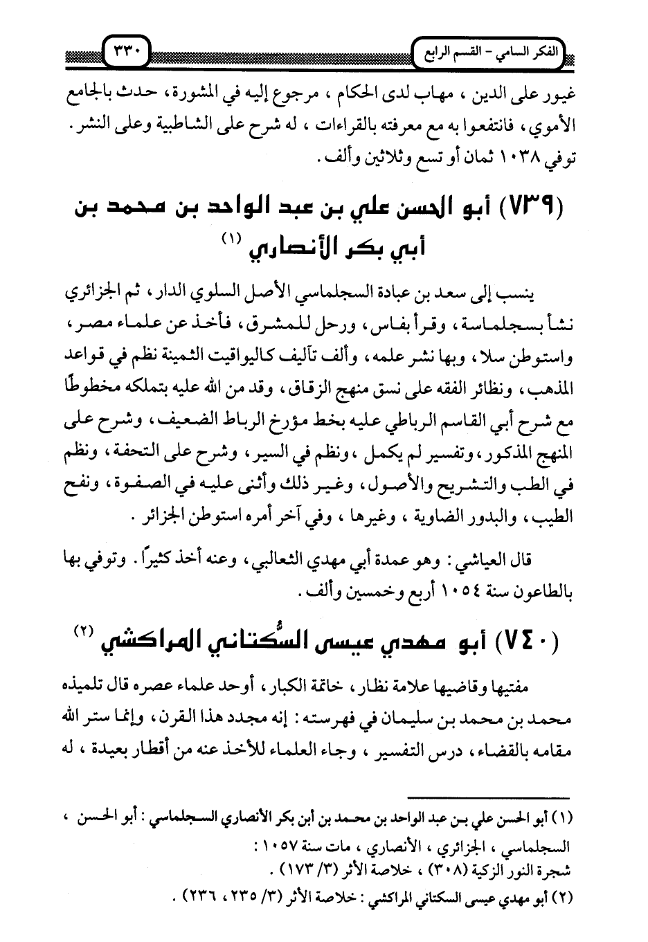 1 أبو الحسن علي بن عبد الواحد بن محمد بن أبي بكر الأنصاري السجلماسي: أبو الحسن، السجلماسي، الجزائري، الأنصاري، مات سنة 1057:
