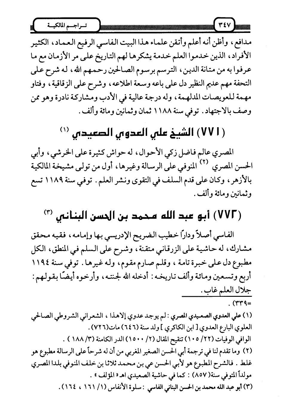 2 وما تقدم لنا في ترجمة أبي الحسن الصغير المغربي من أن له شرحا على الرسالة مطبوع هو غلط. فالشرح المطبوع هو لأبي الحسن علي بن محمد ثلاثا بن خلف المنوفي بلدا المصري مولدا المتوفي سنة "857": كما في حاشية الصعيدي. ا. هـ. "المؤلف".