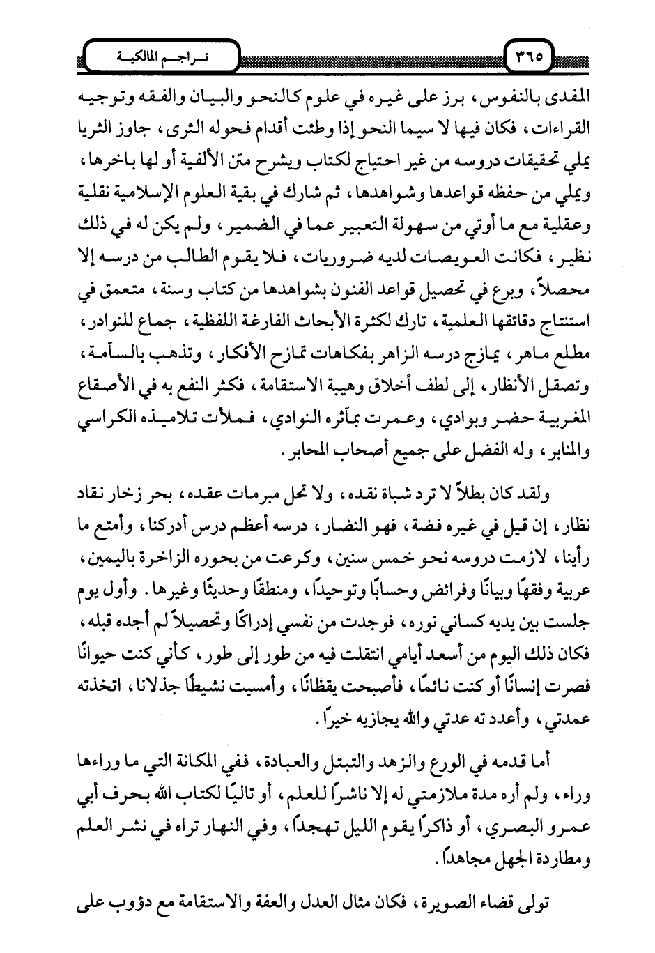 المفدى بالنفوس، برز على غيره في علوم كالنحو والبيان والفقه توجيه القراءات، فكان فيها لا سيما النحو إذا وطئت أقدام فحوله الثرى، جاوز الثريا يملي تحقيقات دروسه من غير احتياج لكتاب ويشرح متن الألفية أولها بآخرها، ويملي من حفظه قواعدها وشواهدها، ثم شارك في بقية العلوم الإسلامية نقلية وعقلية مع ما أوتي من سهولة التعبير عما في الضمير، ولم يكن له في ذلك نظير، فكانت العويصات لديه ضروريات، فلا يقوم الطالب من درسه إلا محصلا، وبرع في تحصيل قواعد الفنون بشواهدها من كتاب وسنة، متعمق في استنتاج دقائقها العلمية، تارك لكثرة الأبحاث الفارغة اللفظية، جماع للنوادر، مطلع ماهر، يمازج درسه الزاهر بفكاهات تمازح الأفكار، وتذهب بالسآمة، وتصقل الأنظار، إلى لطف أخلاق وهيبة الاستقامة، فكثر النفع به في الأصقاع المغربية حضر وبوادي، وعمرت بمآثره النوادي، فملأت تلاميذه الكراسي والمنابر، وله الفضل على جميع أصحاب المحابر.