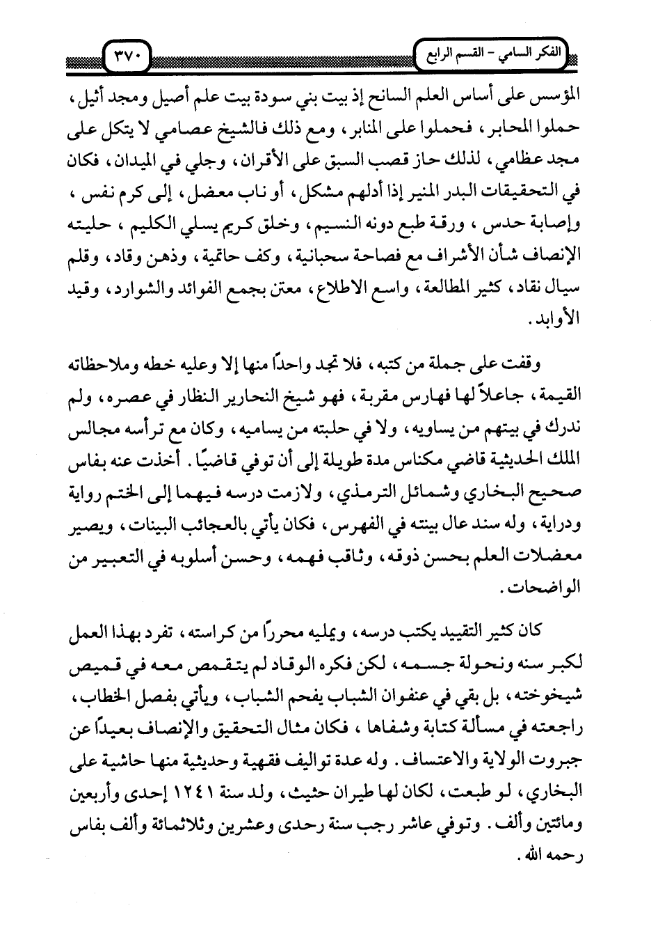 كان كثير التقييد يكتب درسه، ويمليه محررا من كراسته، تفرد بهذا العمل لكبر سنه ونحولة جسمه، لكن فكره الوقاد لم يتقمص معه في قميص شيخوخته، بل بقي في عنفوان الشباب يفحم الشباب، ويأتي بفصل الخطاب، راجعته في مسألة كتابة وشفاها، فكان مثال التحقيق والإنصاف بعيدا عن جبروت الولاية والاعتساف. وله عدة تواليف فقهية وحديثية منها حاشية على البخاري، لو طبعت، لكان لها طيران حثيث، ولد سنة 1241 إحدى وأربعين ومائتين وألف. وتوفي عاشر رجب سنة إحدى وعشرين وثلاثمائة وألف بفاس رحمه الله.