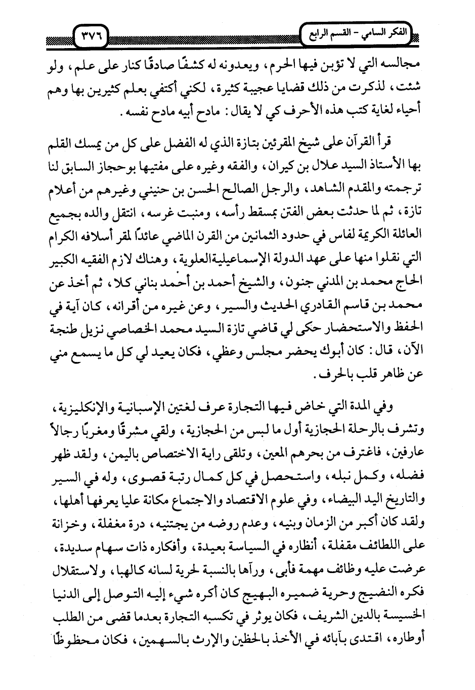 وفي المدة التي خاض فيها التجارة عرف لغتين الإسبانية والإنكليزية، وتشرف بالرحلة الحجازية أول ما لبس من الحجازية، ولقي مشرقا ومغربا رجالا عارفين فاغترف من بحرهم المعين، وتلقى راية الاختصاص باليمن، ولقد ظهر فضله، وكمل نبله، واستحصل في كل كمال رتبة قصوى، وله في السير والتاريخ اليد البيضاء، وفي علوم الاقتصاد والاجتماع مكانة عليا يعرفها أهلها، ولقد كان أكبر من الزمان وبنيه، وعدم روضه من يجتنيه، درة مغفلة، وخزانة على اللطائف مقفلة، أنظاره في السياسة بعيدة، وأفكاره ذات سهام سديدة، عرضت عليه وظائف مهمة فأبى، ورآها بالنسبة لحرية لسانه كالهبا، ولاستقلال فكره النضيج وحرية ضميره البهيج كان أكره شيء إليه التوصل إلى الدنيا الخسيسة بالدين الشريف، فكان يؤثر في تكسبه التجارة بعدما قضى من الطلب أوطاره، اقتدى بآبائه في الأخذ بالحظين والإرث بالسهمين، فكان محظوظا