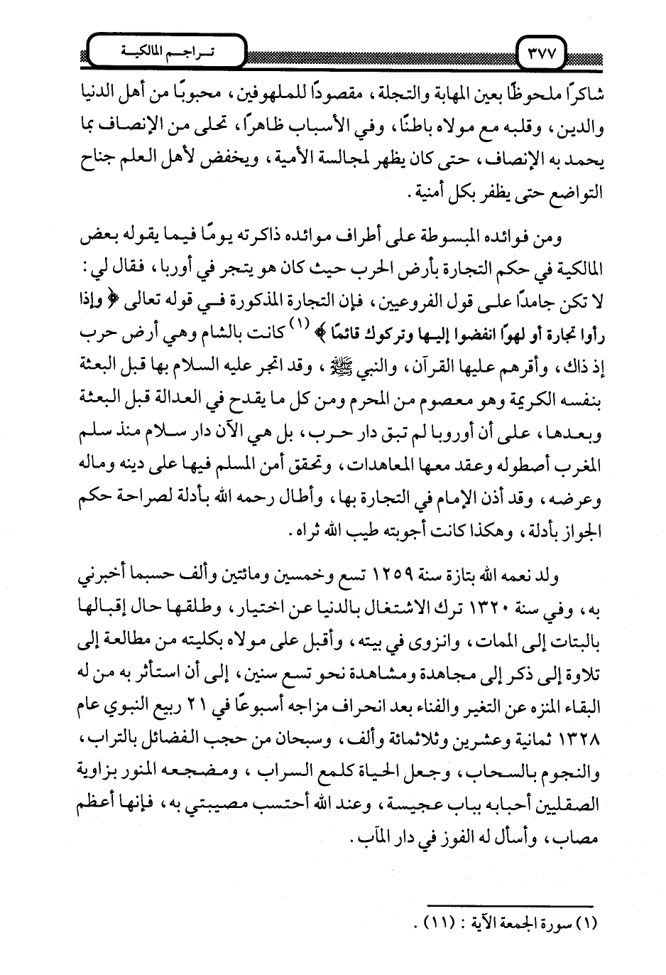 ومن فوائده المبسوطة على أطراف موائده ذاكرته يوما فيما يقوله بعض المالكية في حكم التجارة بأرض الحرب حيث كان هو يتجر في أوربا، فقال لي: لا جامدا على قول الفروعيين، فإن التجارة المذكورة في قوله تعالى: {وَإِذَا رَأَوْا تِجَارَةً أَوْ لَهْوًا انْفَضُّوا إِلَيْهَا وَتَرَكُوكَ قَائِمًا} 1 كانت بالشام وهي أرض حرب إذ ذاك، وأقرهم عليها القرآن، والنبي -صلى الله عليه وسلم، وقد أتجر عليه السلام بها قبل البعثة بنفسه الكريمة وهو معصوم من المحرم ومن كل ما يقدح في العدالة قبل البعثة وبعدها، على أن أوروبا لم تبق دار حرب، بل هي الآن دار سلام منذ سلم المغرب أصطوله وعقد معها المعاهدات، وتحقق أمن المسلم فيها على دينه وماله وعرضه، وقد أذن الإمام في التجارة بها، وأطال رحمه الله بأدلة لصراحة حكم الجواز بأدلة، وهكذا كانت أجوبته طيب الله ثراه.