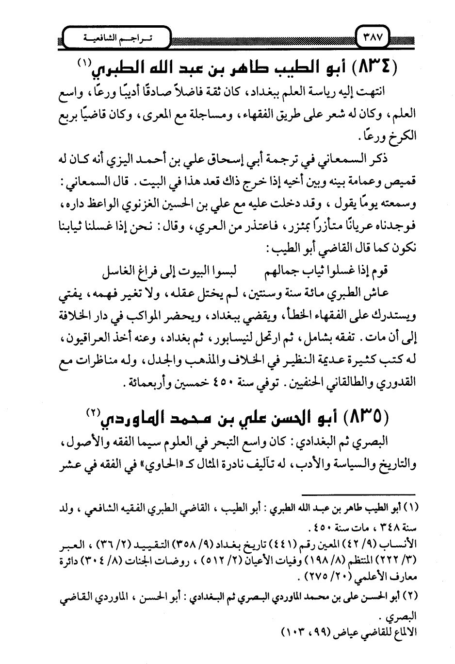 1 أبو الطيب طاهر بن عبد الله الطبري: أبو الطيب، القاضي الطبري الفقيه الشافعي، ولد سنة 348، مات سنة 450.