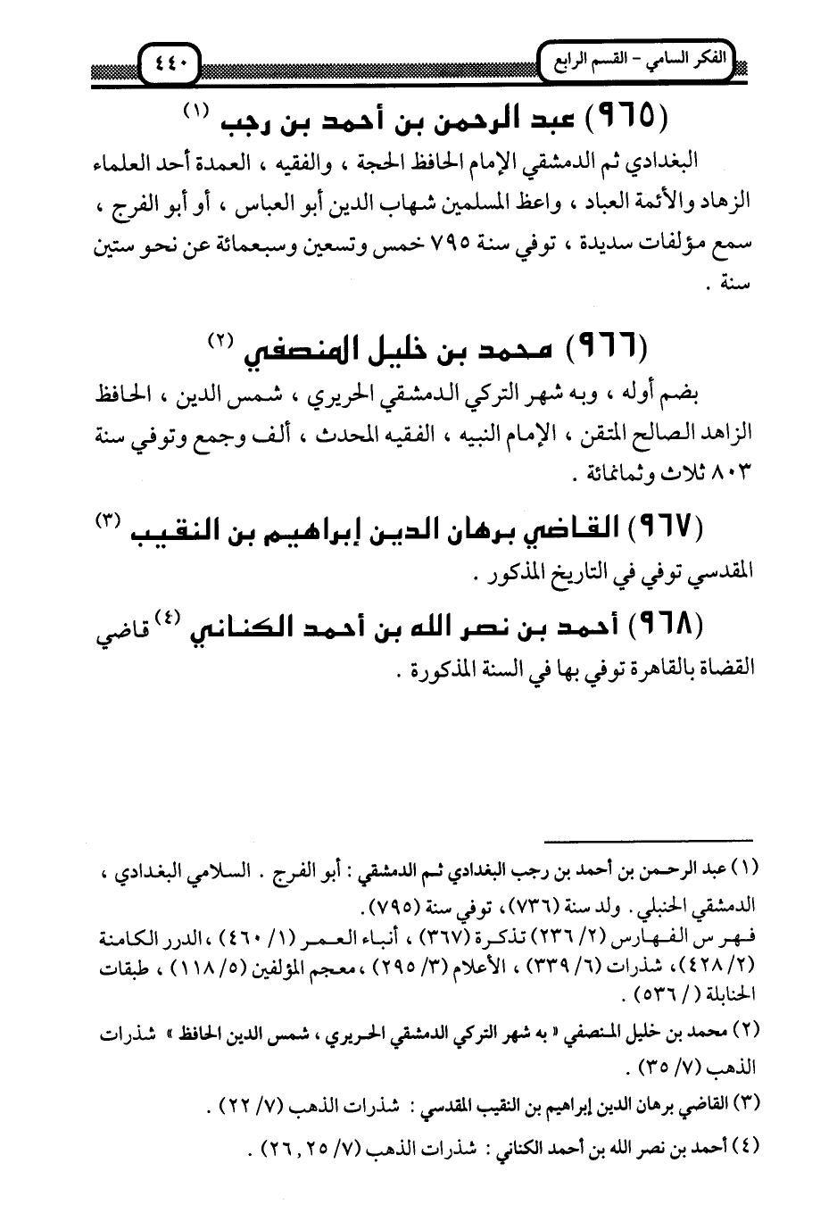 1 عبد الرحمن بن أحمد بن رجب البغدادي ثم الدمشقي: أبو الفرج. السلامي البغدادي، الدمشقي الحنبلي. ولد سنة "736"، توفي سنة "795".