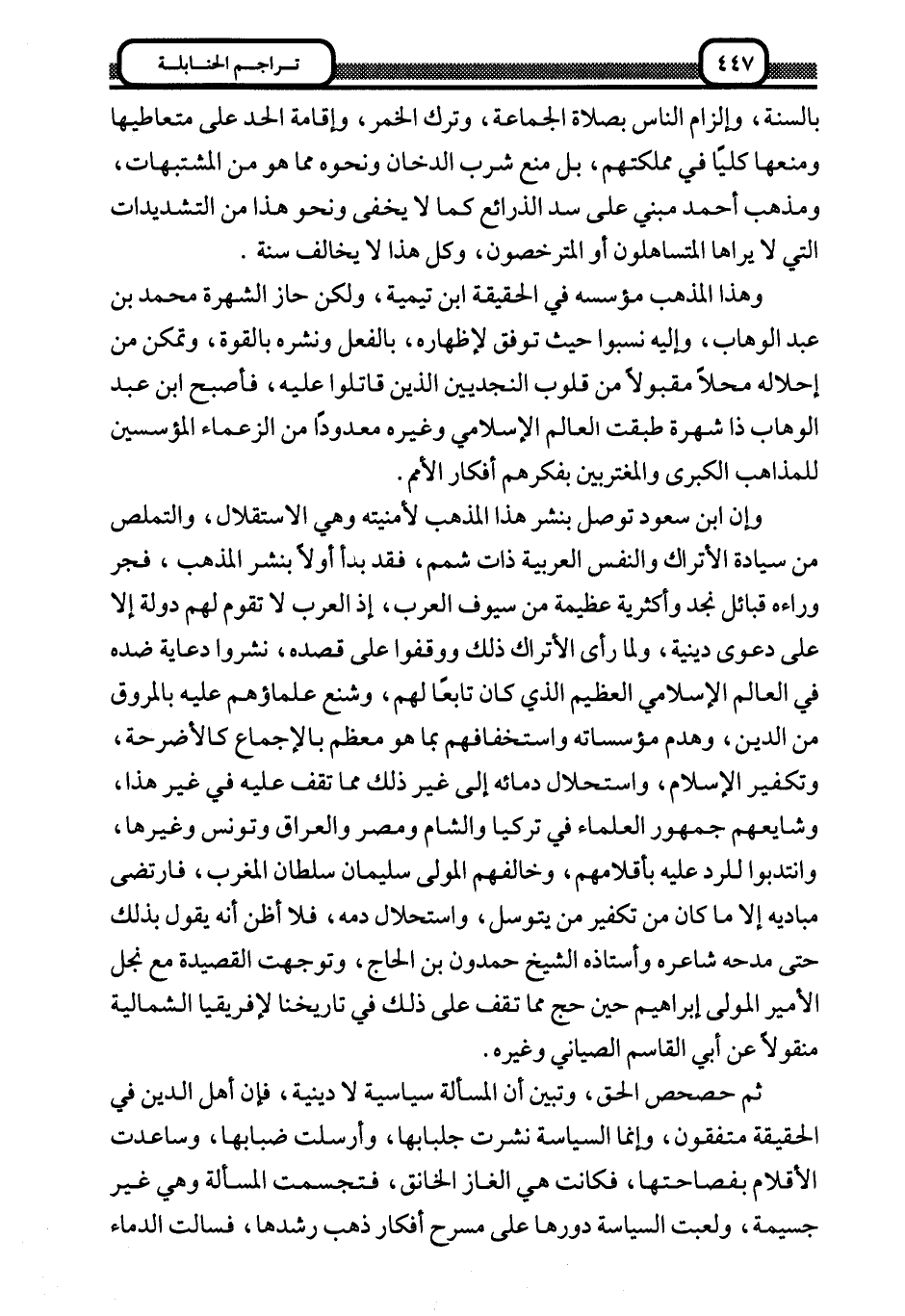 وابن ابن سعود توصل بنشر هذا المذهب لأمنيته وهي الاستقلال، والتملص من سيادة الأتراك والنفس العربية ذات شمم، فقد بدأ أولا بنشر المذهب، فجر وراءه قبائل نجد وأكثرية عظيمة من سيوف العرب؛ إذ العرب لا تقوم لهم دولة إلا على دعوى دينية، ولما رأى الأتراك ذلك ووقفوا على قصده، نشروا دعاية ضده في العالم الإسلامي العظيم الذي كان تابعها لهم، وشنع علماؤهم عليه بالمروق من الدين، وهدم مؤسساته واستخفافهم بما هو معظم بالإجماع كالأضرحة، وتكفير الإسلام، واستحلال دمائه إلى غير ذلك مما تقف عليه في غير هذا، وشايعهم جمهور العلماء في تركيا والشام ومصر والعراق وتونس وغيرها، وانتدبوا للرد عليه بأقلامهم، وخالفهم المولى سليمان سلطان المغرب، فارتضى مباديه إلا ما كان من تكفير من يتوسل، واستحلال دمه، فلا أظن أنه يقول بذلك حتى مدحه شاعره وأستاذه الشيخ حمدون بن الحاج، وتوجهت القصيدة مع نجل الأمير المولى إبراهيم حين حج مما تقف على ذلك في تاريخنا لإفريقيا الشمالية منقولا عن أبي القاسم الصياني وغيره.