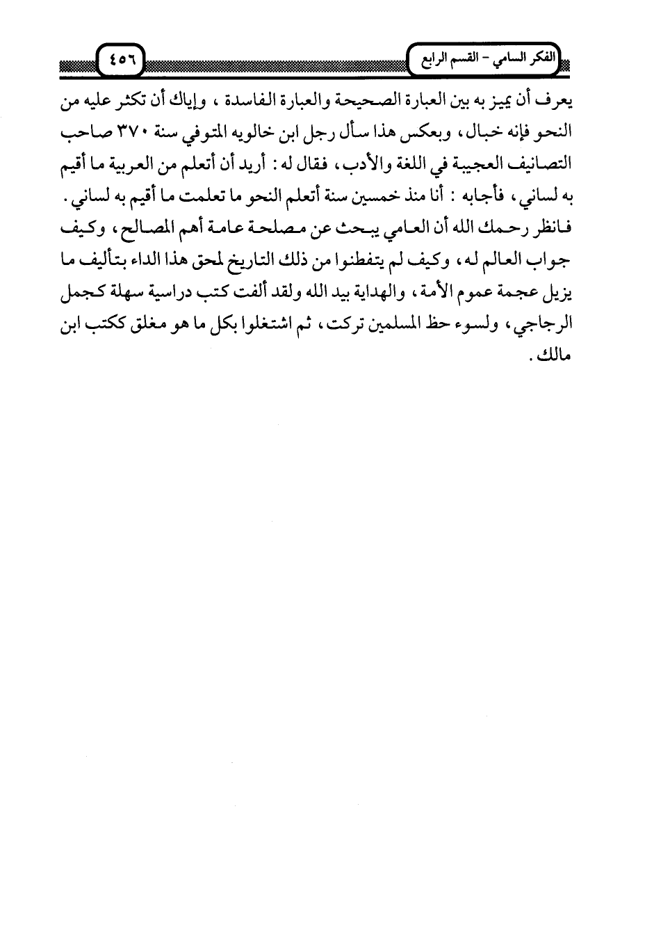 يعرف أن يميز به بين العبارة الصحيحة والعبارة الفاسدة، وإياك أن تكثر عليه من النحو فإنه خبال، وبعكس هذا سأل رجل ابن خالويه المتوفى سنة 370 صاحب التصانيف العجيبة في اللغة والأدب، فقال له: أريد أن أتعلم من العربية ما أقيم به لساني، فأجابه: أنا منذ خمسين سنة أتعلم النحو ما تعلمت ما أقيم به لساني. فانظر رحمك الله أن العامي يبحث عن مصلحة عامة أهم المصالح، وكيف جواب العالم له، وكيف لم يتفطنوا من ذلك التاريخ لمحق هذا الداء بتأليف ما يزيل عجمة عموم الأمة، والهداية بيد الله ولقد ألفت كتب دراسة سهلة كجمل الزجاجي، ولسوء حظ المسلمين تركت، ثم اشتغلوا بكل ما هو مغلق ككتب ابن مالك.
