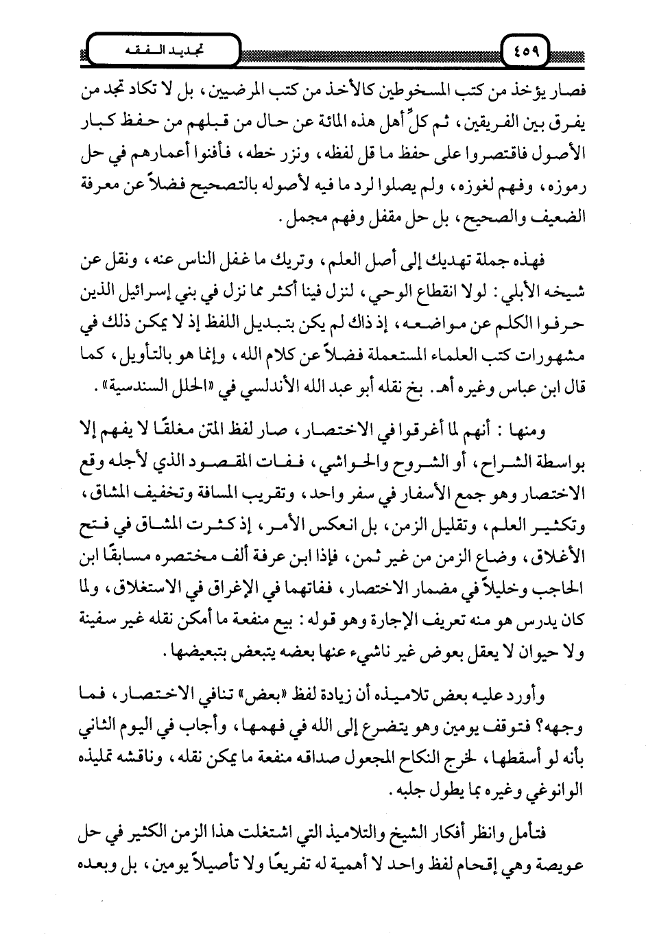 فصار يؤخذ من كتب المسخوطين كالأخذ من كتب المرضيين، بل لا تكاد تجد من يفرق بين الفريقين، ثم كل أهل هذه المائة عن حال من قبلهم من حفظ كبار الأصول فاقتصروا على حفظ ما قل لفظه، ونزر خطه، وفأفنوا أعمارهم في حل رموزه، وفهم لغوزه، ولم يصلوا لرد ما فيه لأصوله بالتصحيح فضلا عن معرفة الضعيف والصحيح، بل حل مقفل وفهم مجمل.