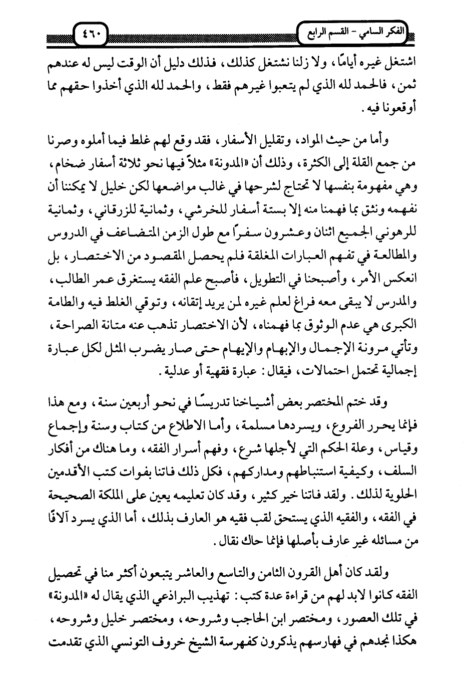 ولقد كان أهل القرون الثامن والتاسع والعاشر يتبعون أكثر منا في تحصيل الفقه كانوا لا بد لهم من قراءة عدة كتب: تهذيب البراذعي الذي يقال له "المدونة" في تلك العصور، ومختصر ابن الحاجب وشروحه، ومختصر خليل وشروحه، وهكذا نجدهم في فهارسهم يذكرون كفهرسة الشيخ خروف التونسي الذي تقدمت