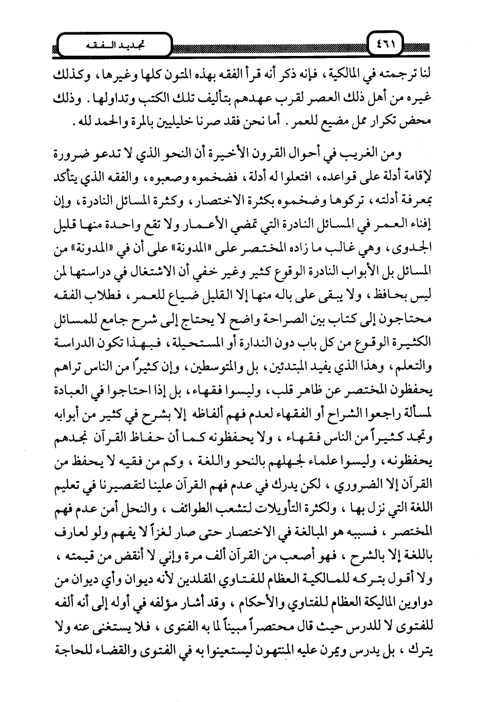 ومن الغريب في أحوال القرون الأخيرة أن النحو الذي لا تدعو ضرورة لإقامة أدلة على قواعده، افتعلوا له أدلة، فضخموه وصعبوه، والفقه الذي يتأكد بمعرفة أدلته، تركوها وضخموه بكثرة الاختصار، وكثرة المسائل النادرة، وإن إفناء العمر في المسائل النادرة التي تمضي الأعمار ولا تقع واحدة منها قليل الجدوى، وهي غالب ما زاده المختصر على "المدونة" على أن في "المدونة" من المسائل بل الأبواب النادرة الوقوع كثير وغير خفي أن الاشتغال في دراستها لمن ليس بحافظ، ولا يبقى على باله منها إلا القليل ضياع للعمر، فطلاب الفقه محتاجون إلى كتاب بين الصراحة واضح لا يحتاج إلى شرح جامع للمسائل الكثيرة الوقوع من كل باب دون الندارة أو المستحيلة، فبهذا تكون الدراسة والتعلم، وهذا الذي يفيد المبتدئين، بل والمتوسطين، وإن كثيرا من الناس تراهم يحفظون المختصر عن ظاهر قلب، وليسوا فقهاء، بل إذا احتاجوا في العبادة لمسألة راجعوا الشراح أو الفقهاء لعدم فهم ألفاظه إلا بشرح في كثير من أبوابه وتجد كثيرا من الناس فقهاء، ولا يحفظونه كما أن حفاظ القرآن نجدهم يحفظونه، وليسوا علماء لجهلهم بالنحو واللغة، وكم من فقيه لا يحفظ من القرآن إلا الضروري، لكن يدرك في عدم فهم القرآن علينا لتقصيرنا في تعليم اللغة التي نزل بها، ولكثرة التأويلات لتشعب الطوائف، والنحل أمن عدم فهم المختصر، فسببه هو المبالغة في الاختصار حتى صار لغزا لا يفهم ولو لعارف باللغة إلا بالشرح، فهو أصعب من القرآن ألف مرة وإني لا أنقص من قيمته، ولا أقول بتركه للمالكية العظام للفتاوي المقلدين لأنه ديوان وأي ديوان من دواوين المالكية العظام للفتاوي والأحكام، وقد أشار مؤلفه في أوله إلى أنه ألفه للفتوى لا للدرس حيث قال مختصرا مبينا لما به الفتوى، فلا يستغنى عنه ولا يترك، بل يدرس ويمرن عليه المنتهون ليستعينوا به في الفتوى والقضاء للحاجة