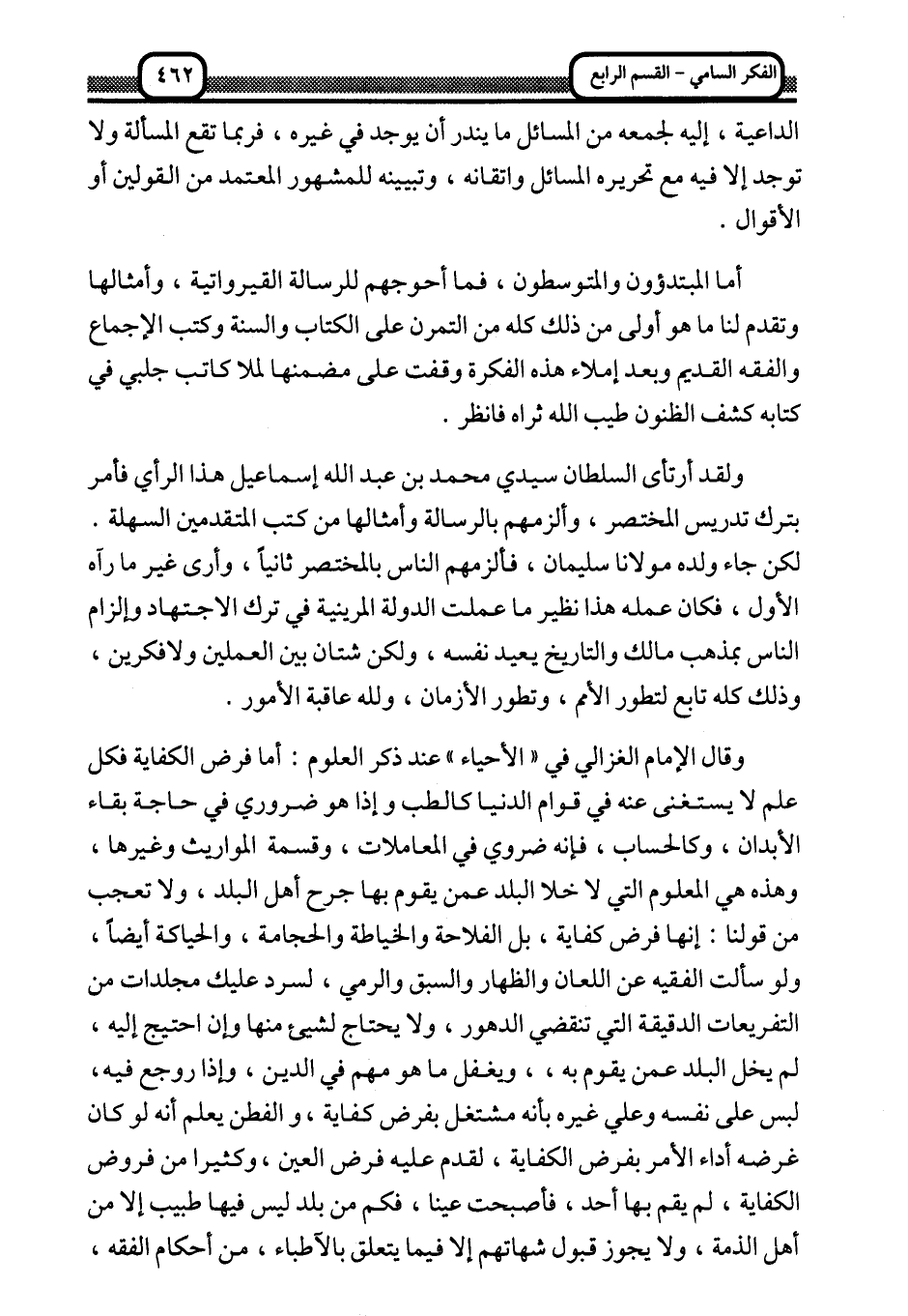 وقال الإمام الغزالي في "الإحياء" عند ذكر العلوم: أما فرض الكفاية فكل علم لا يستغنى عنه في قوام الدنيا كالطب وإذا هو ضروري في حاجة بقاء الأبدان، وكالحساب، فإنه ضروري في المعاملات، وقسمة المواريث وغيرها، وهذه هي المعلوم التي لا خلا البلد عمن يقوم بها جرح أهل البلد، ولا تعجب من قولنا: إنها فرض كفاية، بل الفلاحة والخياطة والحجامة، والحياطة أيضا، ولو سألت الفقيه عن اللعان والظهار والسبق والرمي، لسرد عليك مجلدات من التفريعات الدقيقة التي تنقضي الدهور، ولا يحتاج لشيء منها وإن احتيج إليه، لم يخل البلد عمن يقوم به، ويغفل ما هو مهم في الدين، وإذا روجع فيه، لبس على نفسه وعلى غيره بأنه مشتغل بفرض كفاية، والفطن يعلم أنه لو كان غرضه أداء الأمر بفرض الكفاية، لقدم عليه فرض العين، وكثيرا من فروض الكفاية، لم يقم بها أحد، فأصبحت عينا، فكم من بلد ليس فيها طبيب إلا من أهل الذمة، ولا يجوز قبول شهادتهم إلا فيما يتعلق بالأطباء، من أحكام الفقه،
