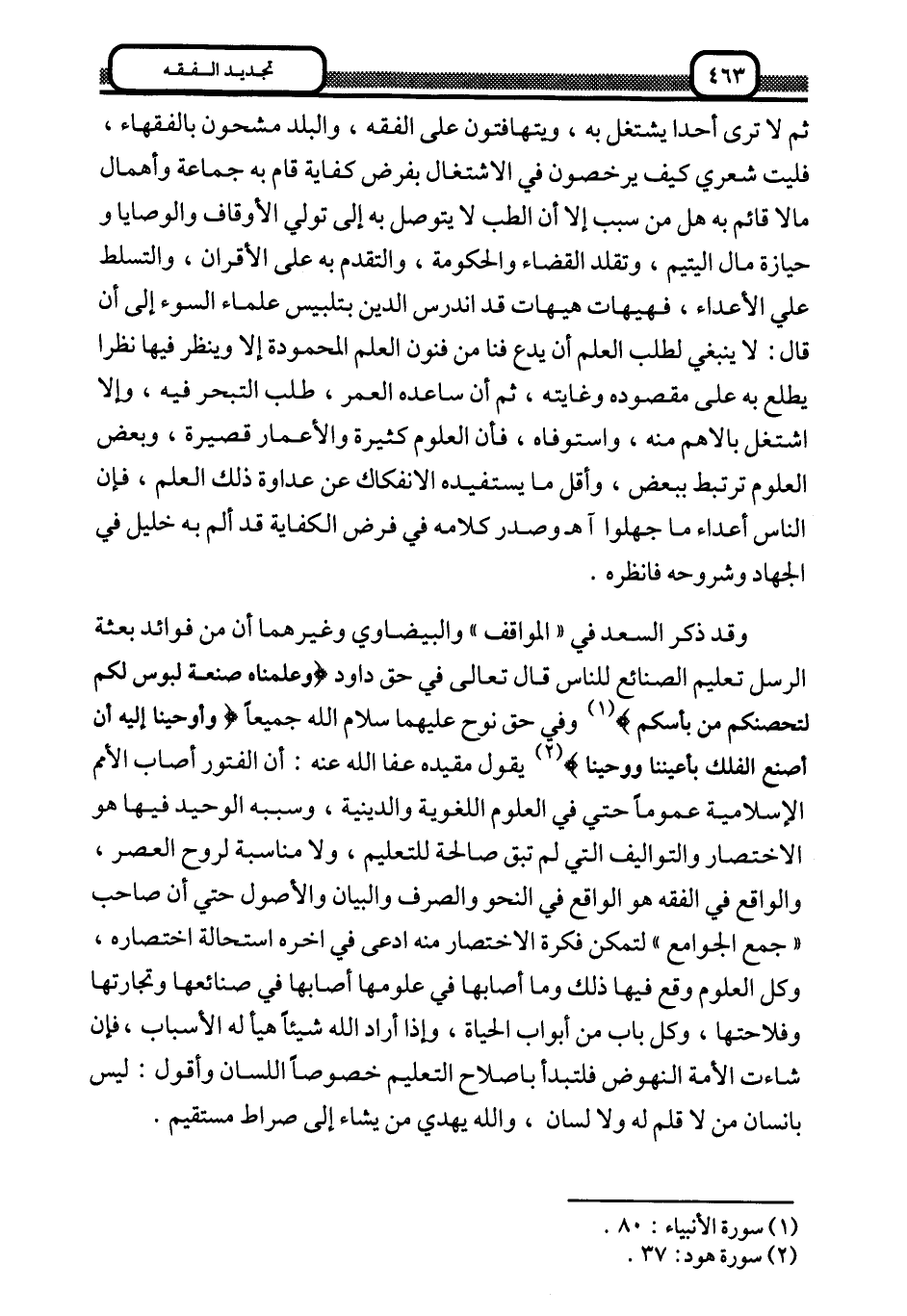 وقد ذكر السعد في "المواقف" والبيضاوي وغيرها أن من فوائد بعثة الرسل تعليم الصنائع للناس قال تعالى في حق داود: {وَعَلَّمْنَاهُ صَنْعَةَ لَبُوسٍ لَكُمْ لِتُحْصِنَكُمْ مِنْ بَأْسِكُمْ} 1 وفي حق نوح عليهما سلام الله جميعا {فَأَوْحَيْنَا إِلَيْهِ أَنِ اصْنَعِ الْفُلْكَ بِأَعْيُنِنَا وَوَحْيِنَا} 2 يقول مقيده عفا الله عنه: إن الفتور أصاب الأمم الإسلامية عموما حتى في العلوم اللغوية والدينية، وسببه الوحيد فيها هو الاختصار والتواليف التي لم تبق صالحة للتعليم، ولا مناسبة لروح العصر، والواقع في الفقه هو الواقع في النحو والصرف والبيان والأصول حتى إن صاحب "جمع الجوامع" لتمكن فكرة الاختصار منه ادعى في آخره استحالة اختصاره، وكل العلوم وقع فيها ذلك وما أصابها في علومها أصابها في صنائعها وتجارتها وفلاحتها، وكل باب من أبواب الحياة، وإذا أراد الله شيئا هيأ له الأسباب، فإن شاءت الأمة النهوض فلتبدأ باصلاح التعليم خصوصا اللسان وأقول: ليس بإنسان من لا قلم له ولا لسان، والله يهدي من يشاء إلى صراط مستقيم.