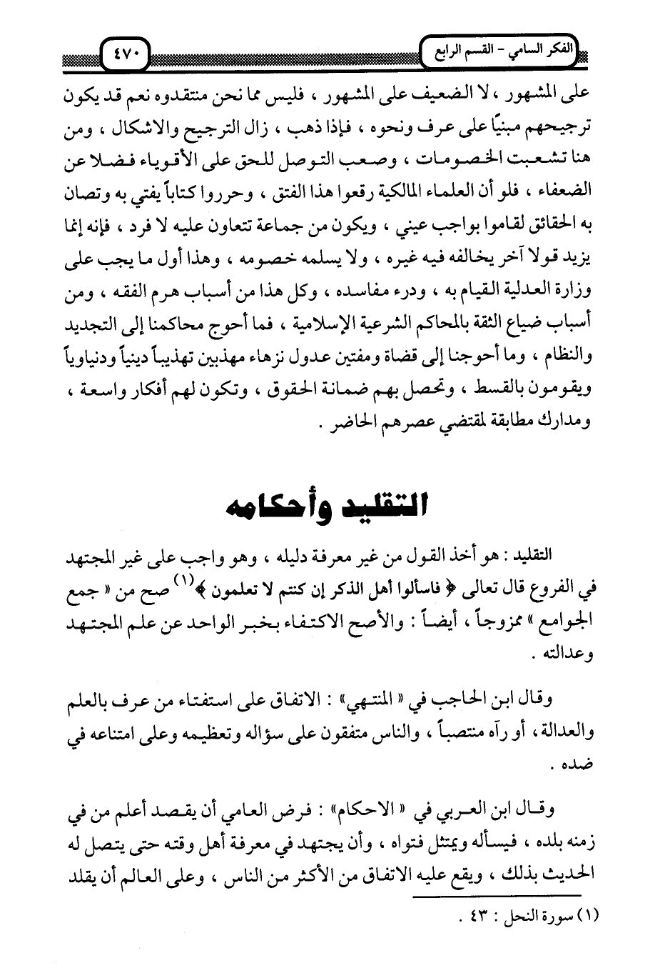 على المشهور، لا الضعيف على المشهور، فليس مما نحن منتقدوه نعم قد يكون ترجيحهم مبنيا على عرف ونحوه، فإذا ذهب، زال الترجيح والإشكال، ومن هنا تشعبت الخصومات، وصعب التوصل للحق على الأقوياء فضلا عن الضعفاء، فلو أن العلماء المالكية رقعوا هذا الفتق، وحرروا كتابا يفتى به وتصان به الحقائق لقاموا بواجب عيني، ويكون من جماعة تتعاون عليه لا فرد، فإنه إنما يزيد قولا آخر يخالفه فيه غيره، ولا يسلمه خصومه، وهذا أول ما يجب على وزارة العدلية القيام به، ودرء مفاسده، وكل هذا من أسباب هرم الفقه، ومن أسباب ضياع الثقة بالمحاكم الشرعية الإسلامية، فما أحوج محاكمنا إلى التجديد والنظام، وما أحوجنا إلى قضاة ومفتين عدول نزهاء مهذبين تهذيبا دينيا ودنياويا ويقومون بالقسط، وتحصل بهم ضمانه الحقوق، وتكون لهم أفكار واسعة، ومدارك مطابقة لمقتضي عصرهم الحاضر.