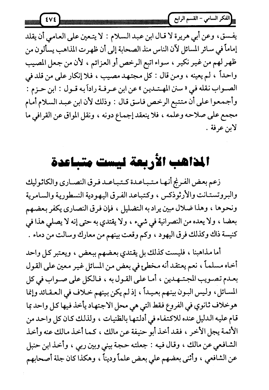 أما مذاهبنا، فليست كذلك بل يقتدي بعضهم ببعض، ويعتبر كل واحد أخاه مسلما، نعم يعتقد أنه مخطئ في بعض المسائل غير معين على القول بعدم تصويب المجتهدين، أما على القول به، فالكل على صواب في كل المسائل، وليس البون بينهم بعيدا؛ إذ لم يكن بينهم خلاف في العقائد وإنما هو خلاف ثانوي في الفروع فقط التي هي محل الاجتهاد يأخذ فيها كل واحد بما قام عليه الدليل عنده للاكتفاء في أدلتها بالظنيات، ولذلك كان كل واحد من الأئمة يجل الأخر، فقد أخذ أبو حنيفة عن مالك، كما أخذ مالك عنه وأخذ الشافعي عن مالك، وقال فيه: جعلته حجة بيني وبين ربي، وأخذ ابن حنبل عن الشافعي، وأثنى بعضهم على بعض علما ودينا، وهكذا كان جلة أصحابهم