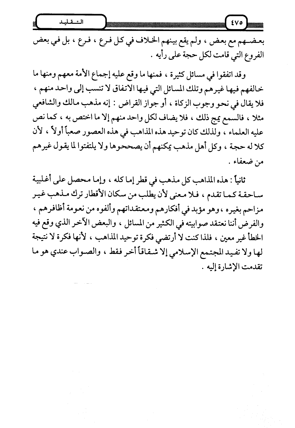 ثانيا: هذه المذاهب كل مذهب في قطر إما كله، وإما محصل على أغلبية ساحقة كما تقدم، فلا معنى لأن يطلب من سكان الأقطار ترك مذهب غير مزاحم بغيره، وهو مؤبد في أفكارهم ومعتقداتهم وألفوه من نعومة أظافرهم، والفرض أننا نعتقد صوابيته في الكثير من المسائل، والبعض الآخر الذي وقع فيه الخطأ غير معين، فلذا كنت لا أرتضي فكرة توحيد المذاهب؛ لأنها فكرة لا نتيجة لها ولا تفيد المجتمع الإسلامي إلا شقاق آخر فقط، والصواب عندي هو ما تقدمت الإشارة إليه.