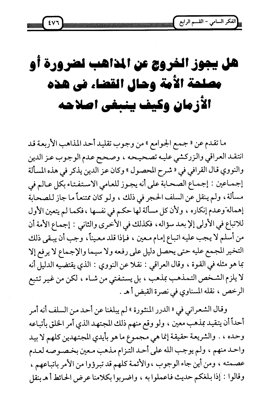 ما تقدم عن "جمع الجوامع" من وجوب تقليد أحد المذاهب الأربعة قد انتقد العراقي والزركشي عليه تصحيحه، وصحح عدم الوجوب عز الدين والنووي قال القرافي في "شرح المحصول" وكان عز الدين يذكر في هذه المسألة إجماعين: إجماع الصحابة على أنه يجوز للعامي الاستفتاء بكل عالم في مسألة، ولم ينقل عن السلف الحجر في ذلك، ولو كان ممتنعا ما جاز للصحابة إهماله وعدم إنكاره، ولأن كل مسألة لها حكم في نفسها، فكما لم يتعين الأول للاتباع في الأولى إلا بعد سؤاله، فكذلك في الأخرى والثاني: إجماع الأمة أن من أسلم لا يجب عليه اتباع إمام معين، فإذا قلد معينا، وجب أن يبقى ذلك التخير المجمع عليه حتى يحصل دليل على رفعه ولا سيما والإجماع لا يرفع إلا بما هو مثله في القوة، وقال العراقي: نقلا عن النووي: الذي يقتضيه الدليل أنه لا يلزم الشخص التمذهب بمذهب، بل يستفتي من شاء، لكن من غير تتبع الرخص، نقله المسناوي في نصرة القبض. ا. هـ.