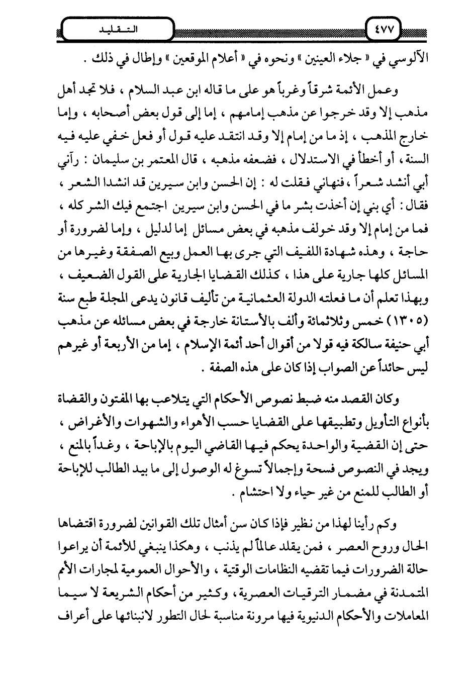 وعمل الأئمة شرقا وغربا هو على ما قاله ابن عبد السلام، فلا تجد أهل مذهب إلا وقد خرجوا عن مذهب إمامهم، إما إلى قول بعض أصحابه، وإما خارج المذهب؛ إذ ما من إمام إلا وقد انتقد عليه قول أو فعل خفي عليه فيه السنة، أو أخطأ في الاستدلال، فضعفه مذهبه، قال المعتمر بن سليمان، رآني أبي أنشد شعرا، فنهاني فقلت له: إن الحسن وابن سيرين قد انشدا الشعر، فقال: أي بني إن أخذت بشر ما في الحسن وابن سيرين اجتمع فيك الشر كله، فما من إمام إلا وقد خولف مذهبه في بعض مسائل إما دليل، وإما لضرورة أو حاجة، وهذه شهادة اللفيف التي جرى بها العمل وبيع الصفقة وغيرها من المسائل كلها جارية على هذا، كذلك القضايا الجارية على القول الضعيف، وبهذا تعلم أن ما فعلته، الدولة العثمانية من تأليف قانون يدعى المجلة طبع سنة "1305" خمس وثلاثمائة وألف بالأستانة خارجة في بعض مسائله عن مذهب أبي حنيفة سالكة فيه قولا من أقوال أحد أئمة الإسلام، إما من الأربعة أو غيرهم ليس حائدا عن الصواب إذا كان على هذه الصفة.