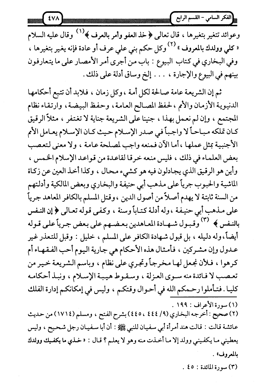 ثم إن الشريعة عامة صالحة لكل أمة، وكل زمان، فلا بد أن تتبع أحكامها الدنيوية الأزمان والأمم، لحفظ المصالح العامة، وحفظ البيضة، وارتقاء نظام المجتمع، وإن لم نعمل بهذا، جنينا على الشريعة جناية لا تغتفر، مثلا الرقيق كان تملكه مباحا لا واجبا في صدر الإسلام حيث كان الإسلام يعامل الأمم الأجنبية بمثل عملها، أما الآن فمنعه واجب لمصلحة عامة، ولا معنى لتعصب بعض العلماء في ذلك، فليس منعه خرقا لقاعدة من قواعد الإسلام الخمس، وأين هو الرقيق الذي يجادلون فيه هو كشيء محال، وكذا أخذ العين عن زكاة الماشية والحبوب جريا على مذهب أبي حنيفة والبخاري وبعض المالكية وأدلتهم من السنة ثابت لا يهدم أصلا من أصول الدين، وقتل المسلم بالكافر المعاهد جريا على مذهب أبي حنيفة، وله أدلة كتابا وسنة، وكفى قوله تعالى: {أَنَّ النَّفْسَ بِالنَّفْسِ} 3 وقبول شهادة المعاهدين بعضهم على بعض جريا على قوله أيضا، وله دليله، بل قبول شهادة الكافر على المسلم، خليل: وقبل للتعذر غير عدول وإن مشركين، فأمثال هذه الأحكام هي جارية اليوم أحب الفقهاء أم كرهوا، فلأن نجعل لها مخرجا وتجري على نظام، وباسم الشريعة خير من تعصب لا فائدة منه سوى العزلة، وسقوط هيبة الإسلام، ونبذ أحكامه كليا. فتأملوا رحمكم الله في أحوال وقتكم، وليس في إمكانكم إدارة الفلك