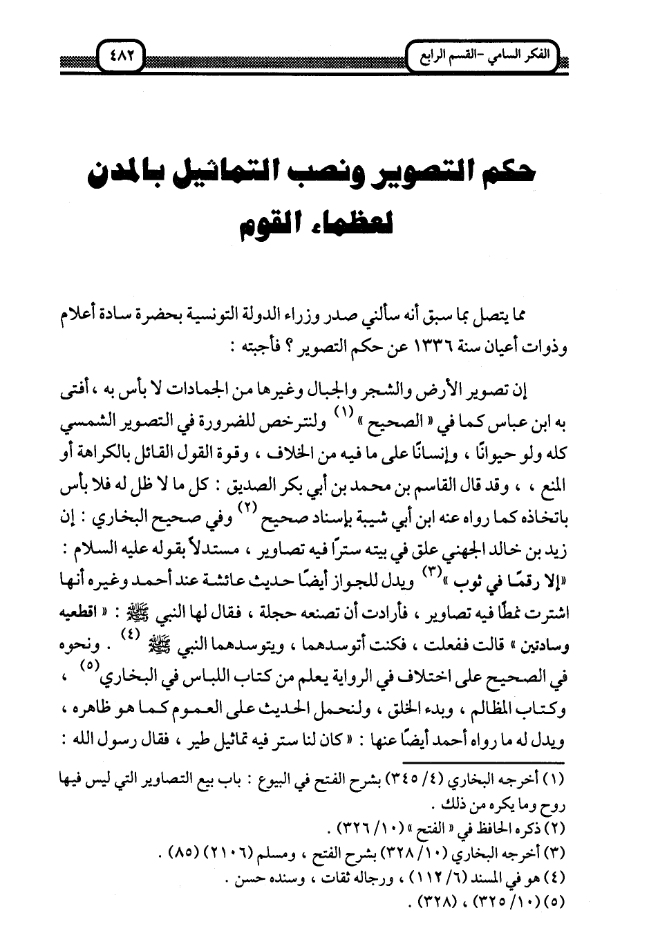 مما يتصل بما سبق أنه سألني صدر وزراء الدولة التونسية بحضرة سادة أعلام وذوات أعيان سنة 1336 عن حكم التصوير؟ فأجبته: