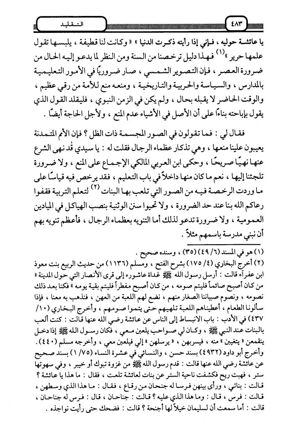 "يا عائشة حوليه، فإني إذا رأيته ذكرت الدنيا" وكانت لنا قطيفة، يلبسها تقول علمها حرير1، فهذا دليل ترخصنا من السنة ومن النظر لما يدعو إليه الحال من ضرورة العصر، فإن التصوير الشمسي، صار ضروريا في الأمور التعليمية بالمدارس، والسياسة والحربية والتاريخية، ومنعه منع للأمة من رقي عظيم، والوقت الحاضر لا يقبله بحال، ولم يكن في الزمن النبوي، فليقلد القول الذي يقول بإباحته بناء على أن الأصل في الأشياء عدم المنع، ولأجل الحاجة أيضا.