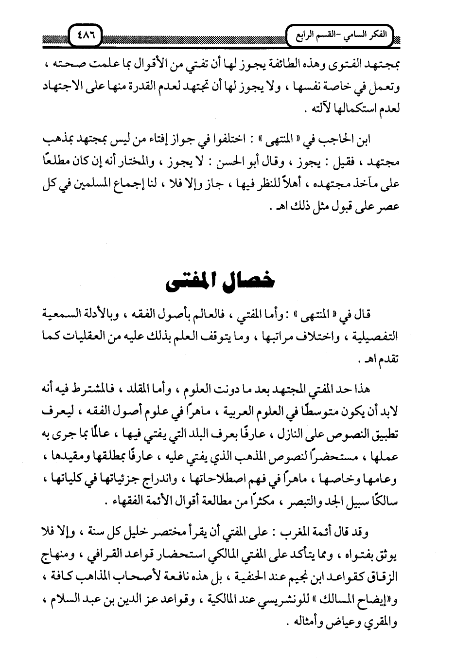 بمجتهد الفتوى وهذه الطائفة يجوز لها أن تفتي من الأقوال بما علمت صحته، وتعمل في خاصة نفسها، ولا يجوز لها أن تجتهد لعدم القدرة منها على الاجتهاد لعدم استكمالها لآلته.