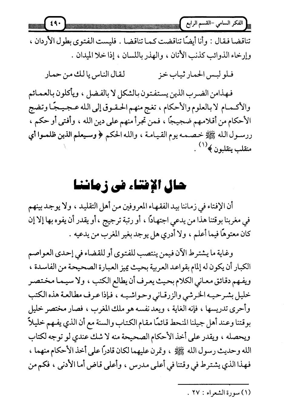 إن الإفتاء في زماننا بيد الفقهاء المعروفين من أهل التقليد، ولا يوجد بينهم في مغربنا بوقتنا هذا من يدعي اجتهادا، أو رتبة ترجيح، أو يقدر أن يفوه بها إلا إن كان معتوها فيما أعلم، ولا أدري هل يوجد بغير المغرب من يدعيه.