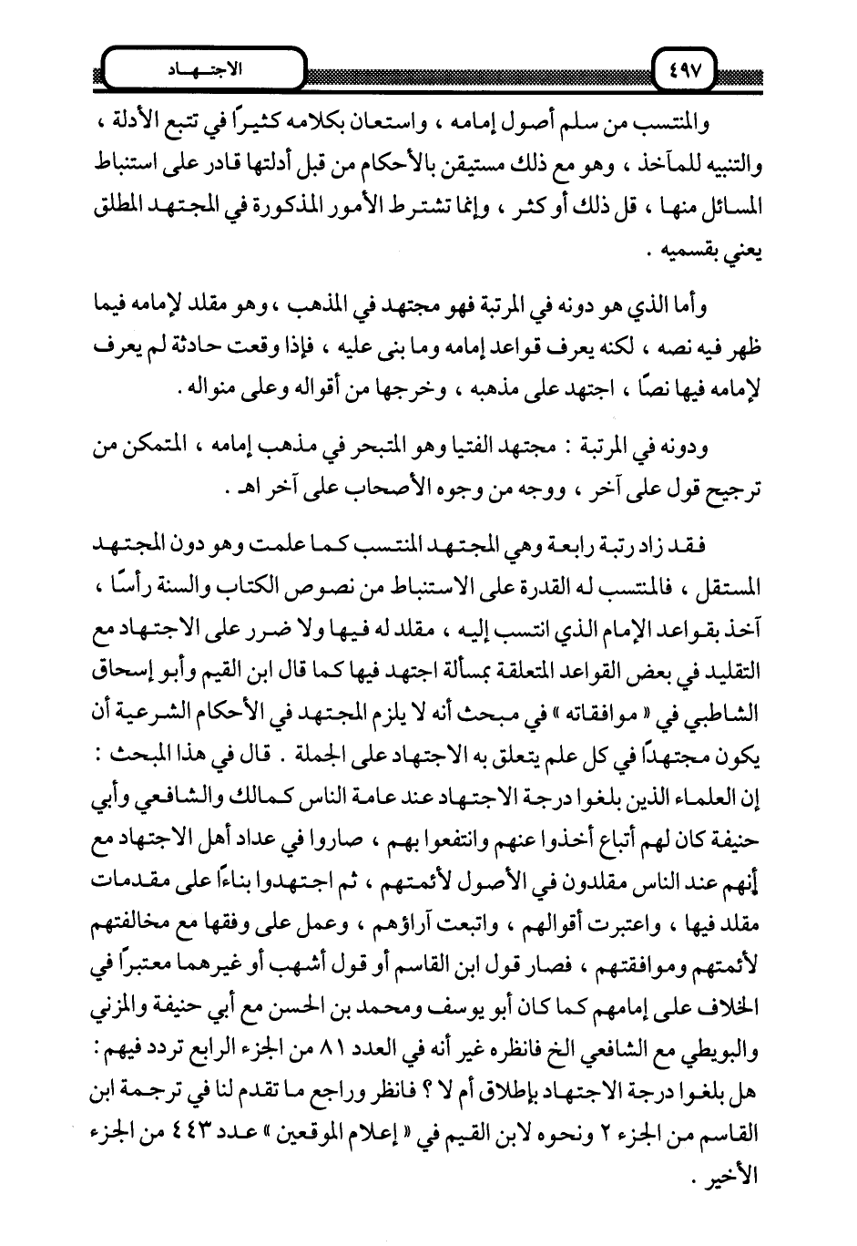 فقد زاد رتبة رابعة وهي المجتهد المنتسب كما علمت وهو دون المجتهد المستقل، فالمنتسب له القدرة على الاستنباط من نصوص الكتاب والسنة رأسا، آخذ بقواعد الإمام الذي انتسب إليه، مقلد له فيها ولا ضرر على الاجتهاد مع التقليد في بعض القواعد المتعلقة بمسألة اجتهد فيها كما قال ابن القيم وأبو إسحاق الشاطبي في "موافقاته" في مبحث أنه لا يلزم المجتهد في الأحكام الشرعية أن يكون مجتهدا في كل علم يتعلق به الاجتهاد على الجملة. قال في هذا المبحث: إن العلماء الذين بلغوا درجة الاجتهاد عند عامة الناس كمالك والشافعي وأبي حنيفة كان لهم أتباع أخذوا عنهم وانتفعوا بهم، صاروا في عداد أهل الاجتهاد مع أنهم عند الناس مقلدون في الأصول لأئمتهم، ثم اجتهدوا بناء على مقدمات مقلد فيها، واعتبرت أقوالهم، واتبعت آراؤهم، وعمل على وفقها مع مخالفتهم لأئمتهم وموافقتهم، فصار قول ابن القاسم أو قول أشهب أو غيرهما معتبرا في الخلاف على إمامهم كما كان أبو يوسف ومحمد بن الحسن مع أبي حنيفة والمزني والبويطي مع الشافعي إلخ فانظره غير أنه في العدد 81 من الجزء الرابع تردد فيهم: هل بلغوا درجة الاجتهاد بإطلاق أم لا؟ فانظر وراجع ما تقدم لنا في ترجمة ابن القاسم من الجزء 2 ونحوه لابن القاسم في "إعلام الموقعين" عدد 443 من الجزء الأخير.