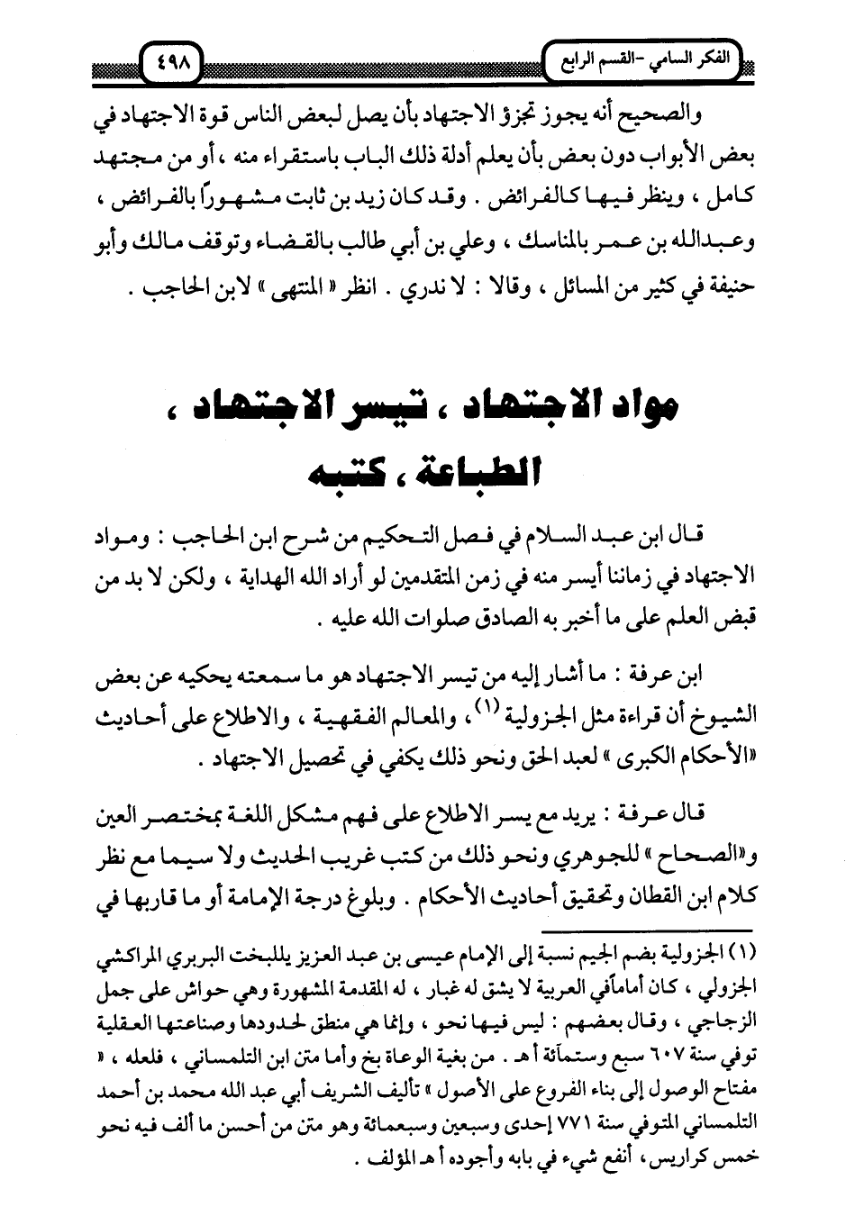 ابن عرفة: ما أشار إليه من تيسر الاجتهاد هو ما سمعته يحكيه عن بعض الشيوخ أن قراءة مثل الجزولية1، والمعالم الفقهية، والاطلاع على أحاديث "الأحكام الكبرى" لعبد الحق ونحو ذلك يكفي في تحصيل الاجتهاد.