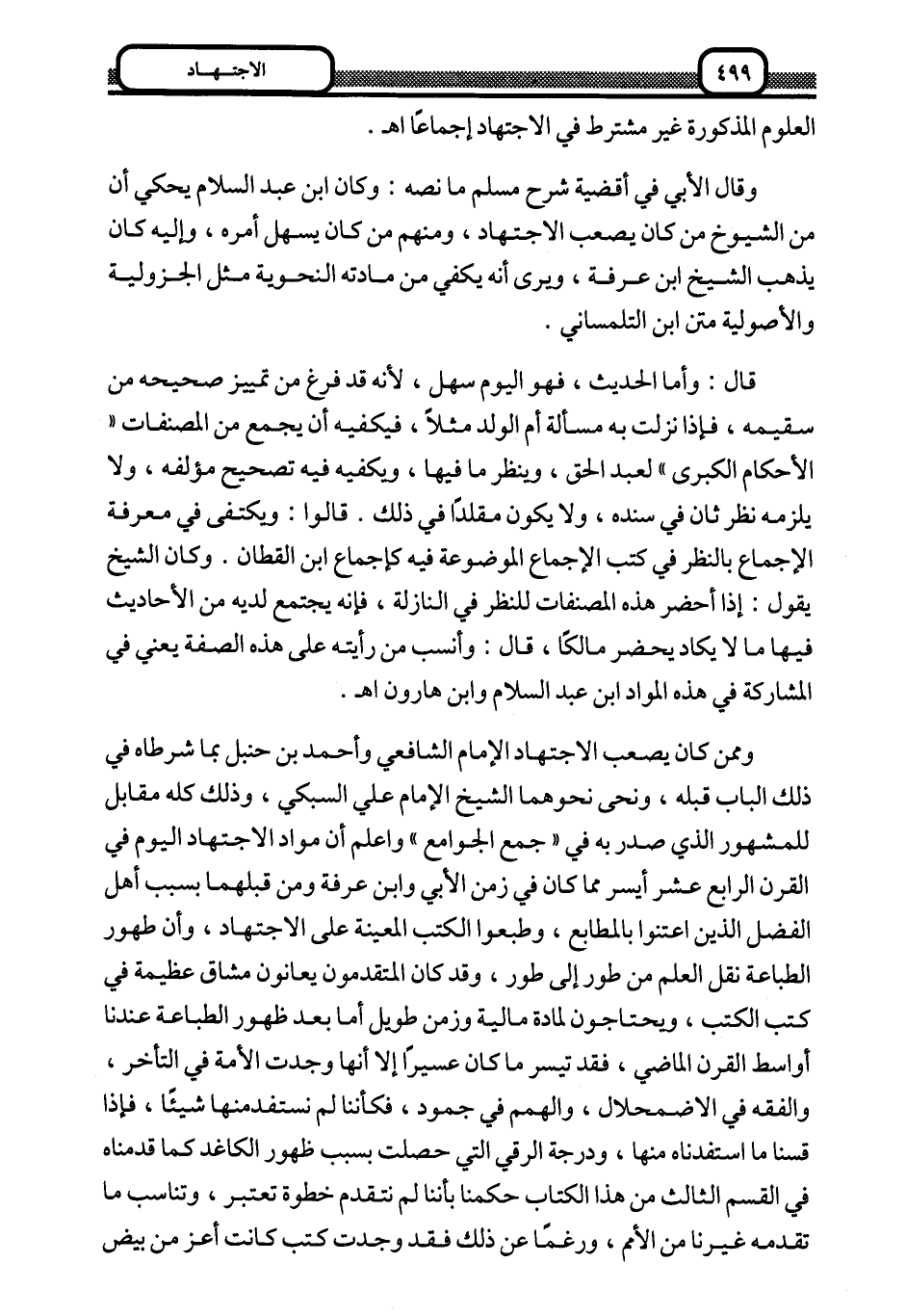 وممن كان يصعب الاجتهاد الإمام الشافعي وأحمد بن حنبل بما شرطاه في ذلك الباب قبله، ونحى نحوهما الشيخ الإمام علي السبكي، وذلك كله مقابل للمشهور الذي صدر به في "جمع الجوامع" واعلم أن مواد الاجتهاد اليوم في القرن الرابع عشر أيسر مما كان في زمن الأبي وابن عرفة ومن قبلهما بسبب أهل الفضل الذين اعتنوا بالمطابع، وطبعوا الكتب المعينة على الاجتهاد، وأن طهور الطباعة نقل العلم من طور إلى طور، وقد كان المتقدمون يعانون مشاق عظيمة في كتب الكتب، ويحتاجون لمادة مالية وزمن طويل أما بعد ظهور الطباعة عندنا أواسط القرن الماضي، فقد تيسر ما كان عسيرا إلا أنها وجدت الأمة في التأخر، والفقه في الاضمحلال، والهمم في جمود، فكأننا لم نستفد منها شيئا، فإذا قسنا ما استفدناه منها، ودرجة الرقي التي حصلت بسبب ظهور الكاغد كما قدمناه في القسم الثالث من هذا الكتاب حكمنا بأننا لم نتقدم خطوة تعتبر، وتناسب ما تقدمه غيرنا من الأمم، ورغما عن ذلك فقد وجدت كتب كانت أعز من بيض