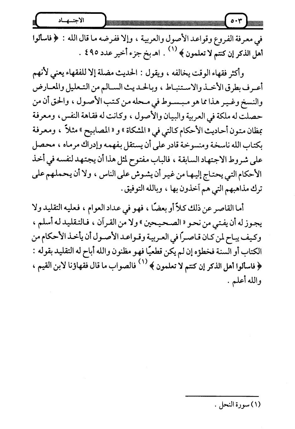 في معرفة الفروع وقواعد الأصول والعربية، وإلا ففرضه ما قاله الله: {فَاسْأَلُوا أَهْلَ الذِّكْرِ إِنْ كُنْتُمْ لَا تَعْلَمُونَ} 1. ا. هـ. بخ جزء أخير عدد 495.