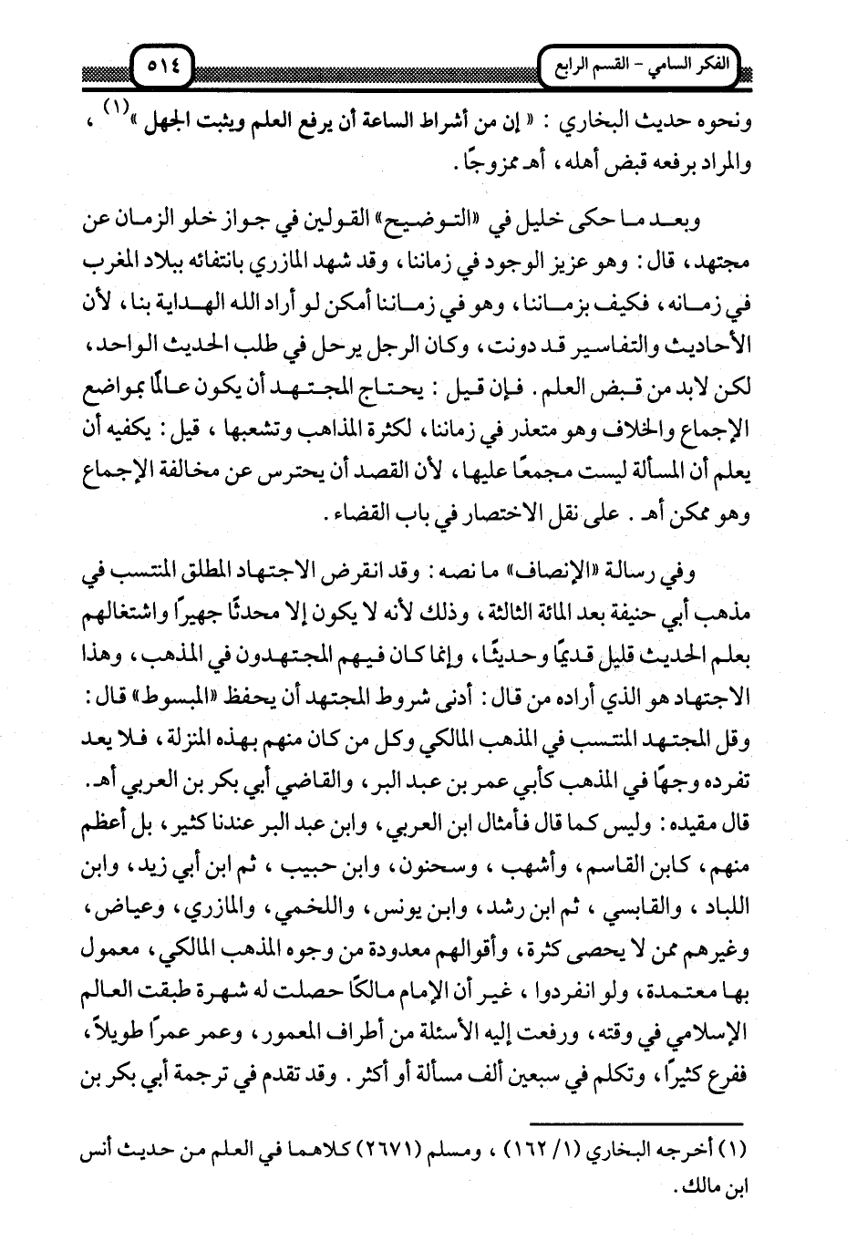 وبعدما حكى خليل في "التوضيح" القولين في جواز خلو الزمان عن مجتهد، قال: وهو عزيز الوجود في زماننا، وقد شهد المازري بانتفائه ببلاد المغرب في زمانه، فكيف بزماننا، وهو في زماننا أمكن لو أراد الله الهداية بنا؛ لأن الأحاديث والتفاسير قد دونت، وكان الرجل يرحل في طلب الحديث الواحد، لكن لا بد من قبض العلم. فإن قيل: يحتاج المجتهد أن يكون عالما بمواضع الإجماع والخلاف وهو متعذر في زماننا، لكثرة المذاهب وتشعبها، قيل: يكفيه أن يعلم أن المسألة ليست مجمعا عليها؛ لأن القصد أن يحترس عن مخالفة الإجماع وهو ممكن. ا. هـ. على نقل الاختصار في باب القضاء.