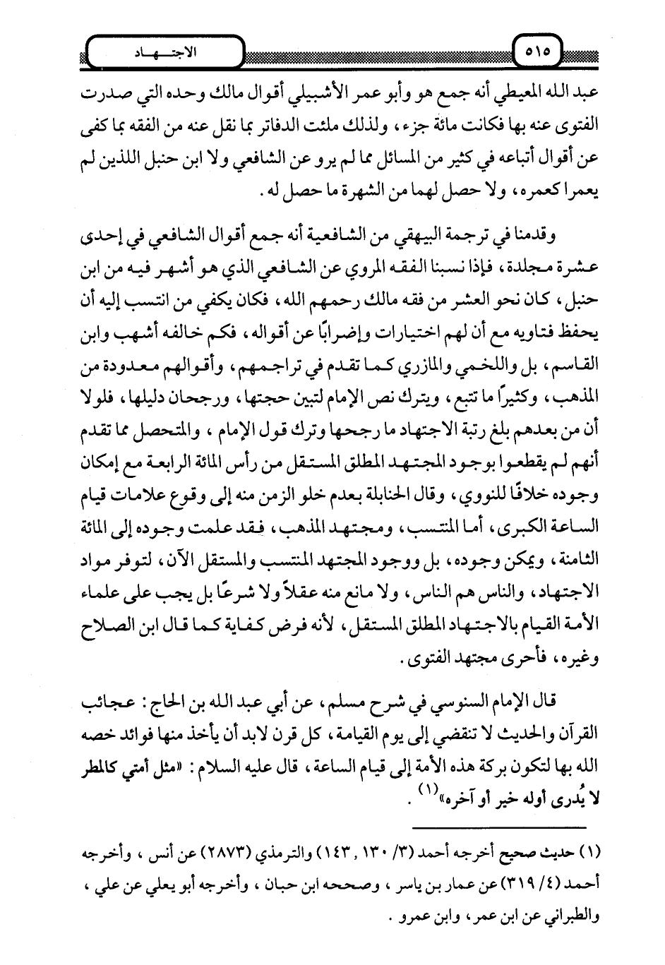 وقدمنا في ترجمة البيهقي من الشافعية أنه جمع أقوال الشافعي في إحدى عشرة مجلدة، فإذا نسبنا الفقه المروي عن الشافعي الذي هو أشهر فيه من ابن حنبل، كان نحو العشر من فقه مالك رحمهم الله، فكان يكفي من انتسب إليه أن يحفظ فتاويه مع أنه لهم اختيارات وإضرابا عن أقواله، فكم خالفه أشهب وابن القاسم، بل واللخمي والمازري كما في تراجمهم، وأقوالهم معدودة من المذهب، وكثيرا مما تتبع، ويترك نص الإمام لتبين حجتها، ورجحان دليلها، فلولا أن من بعدهم بلغ رتبة الاجتهاد ما رجحها وترك قول الإمام، والمتحصل مما تقدم أنهم لم يقطعوا بوجود المجتهد المطلق المستقل من رأس المائة الرابعة مع إمكان وجوده خلافا للنووي، وقال الحنابلة بعدم خلو الزمن منه إلى وقوع علامات قيام الساعة، أما المنتسب، ومجتهد المذهب، فقد علمت وجوده إلى المائة الثامنة، ويمكن وجوده، بل ووجود المجتهد المنتسب والمستقل الآن، لتوفر مواد الاجتهاد، والناس هم الناس، ولا مانع منه عقلا ولا شرعا بل يجب على علماء الأمة القيام بالاجتهاد المطلق المستقل؛ لأنه فرض كفاية كما قال ابن الصلاح وغيره، فأحرى مجتهد الفتوى.