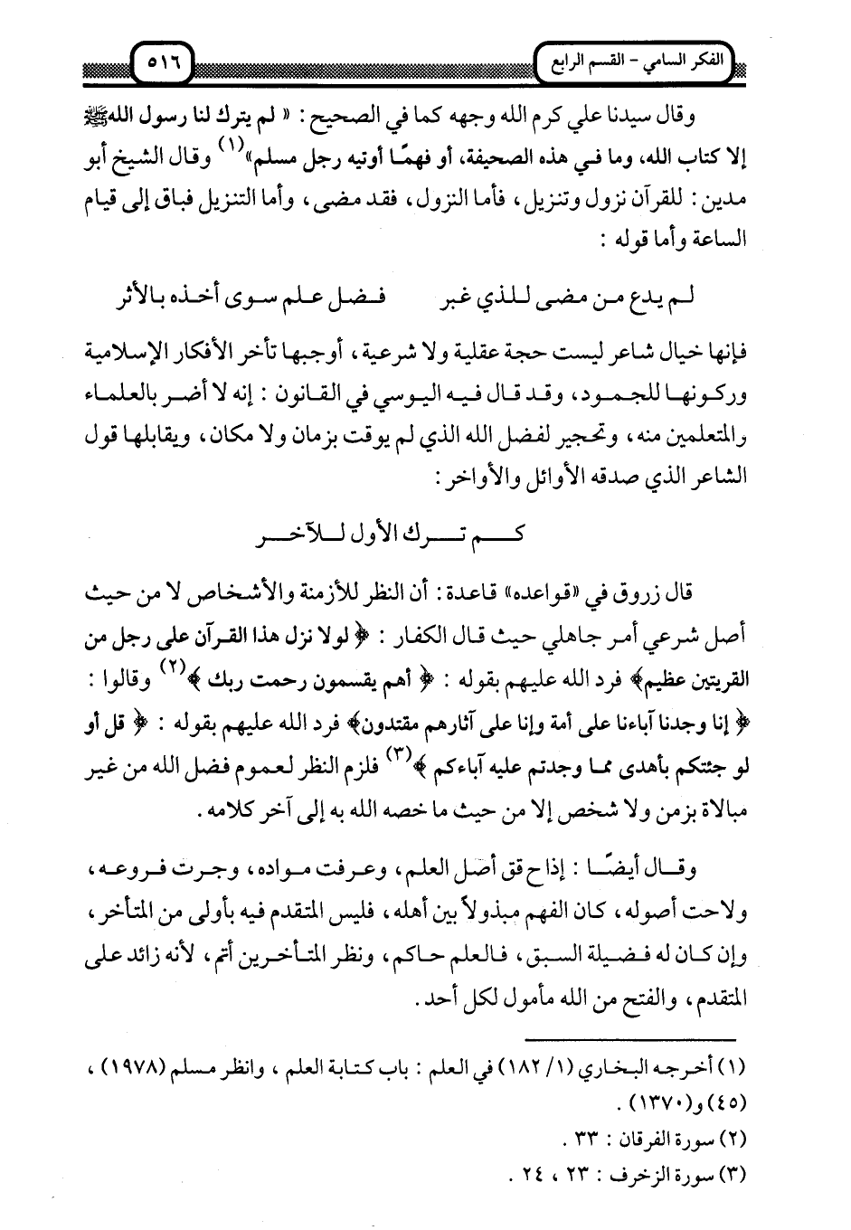 قال زروق في "قواعده" قاعدة: أن النظر للأزمنة والأشخاص لا من حيث أصل شرعي أمر جاهلي حيث قال الكفار: {لَوْلَا نُزِّلَ هَذَا الْقُرْءانُ عَلَى رَجُلٍ مِنَ الْقَرْيَتَيْنِ عَظِيمٍ} فرد الله عليهم بقوله: {أَهُمْ يَقْسِمُونَ رَحْمَتَ رَبِّكَ} 2 وقالوا: {إِنَّا وَجَدْنَا آَبَاءَنَا عَلَى أُمَّةٍ وَإِنَّا عَلَى آَثَارِهِمْ مُقْتَدُونَ} فرد الله عليهم بقوله: {قَالَ أَوَلَوْ جِئْتُكُمْ بِأَهْدَى مِمَّا وَجَدْتُمْ عَلَيْهِ آَبَاءَكُمْ} 3 فلزم النظر لعموم فضل الله من غير مبالاة بزمن ولا شخص إلا من حيث ما خصه الله به إلى آخر كلامه.