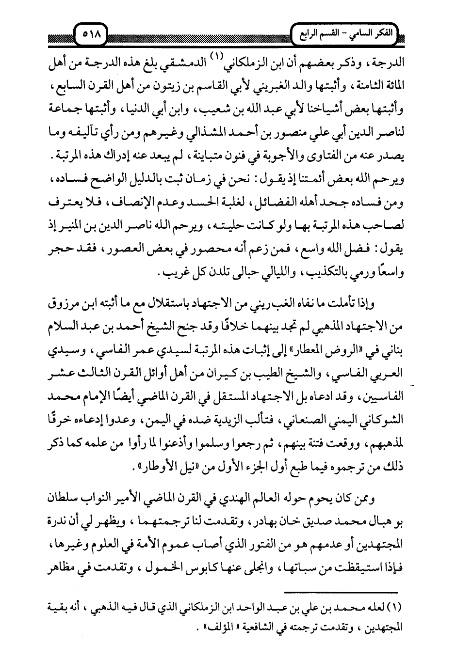 وإذا تأملت ما نفاه الغبريني من الاجتهاد باستقلال مع ما أثبته ابن مرزوق من الاجتهاد المذهبي لم تجد بينهما خلافا وقد جنح الشيخ أحمد بن عبد السلام بناني في "الروض المعطار" إلى إثبات هذه المرتبة لسيدي عمر الفاسي، وسيدي العربي الفاسي، والشيخ الطيب بن كيران من أهل أوائل القرن الثالث عشر الفاسيين، وقد ادعاه بل الاجتهاد المستقل في القرن الماضي أيضا الإمام محمد الشوكاني اليمني الصنعاني، فتألب الزيدية ضده في اليمن، وعدوا إدعاءه خرقا لمذهبهم، ووقعت فتنة بينهم، ثم رجعوا وسلموا أذعنوا لما رأوا من علمه كما ذكر ذلك من ترجموه فيما طبع أول الجزء الأول من "نيل الأوطار".